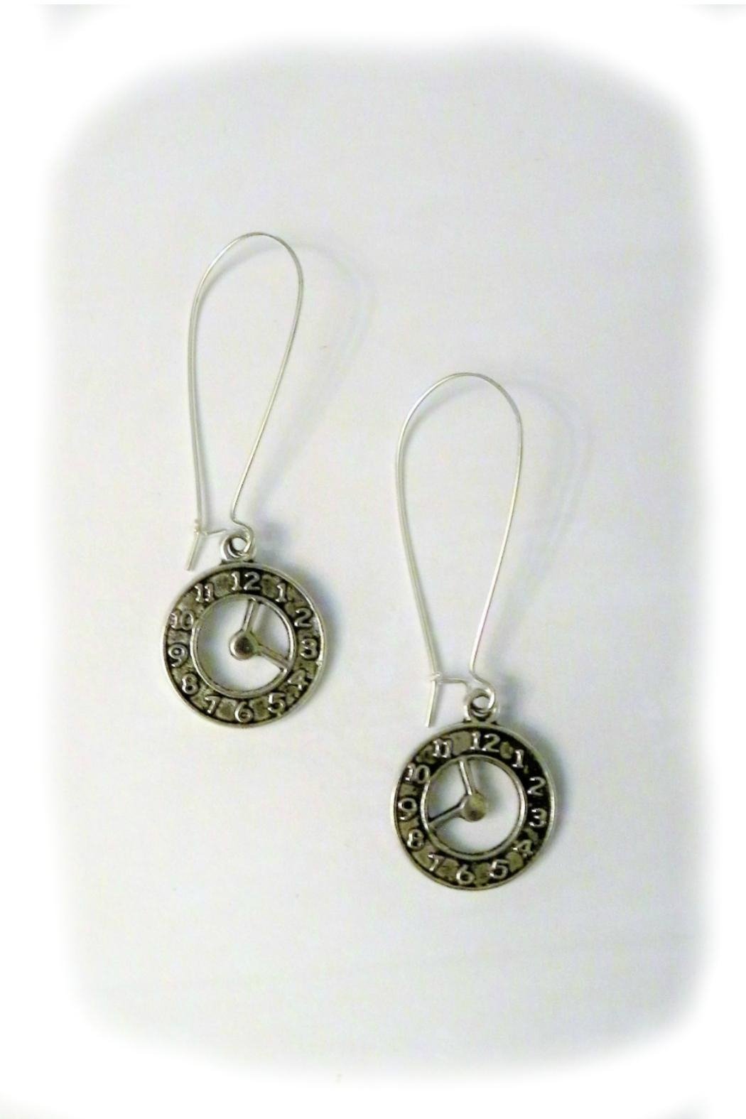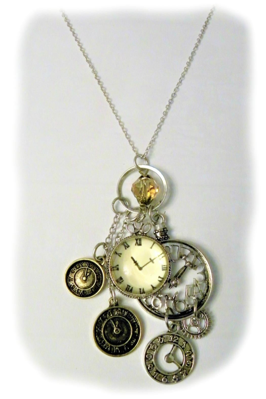 This set is a Mimi's exclusive! A number of brass and silver tone types of watch faces and parts hang from a 30" silver tone chain. A Swarovski crystal hangs from the center. Currently one of the fastest growing trends in jewelry, this necklace has matching earrings that are 2" long and are made on latching hooks. Necklace has standard lobster clasp. A good reminder that today is the "time" to live! Click on "Mimi's Gift Gallery" for more trend setting jewelry.