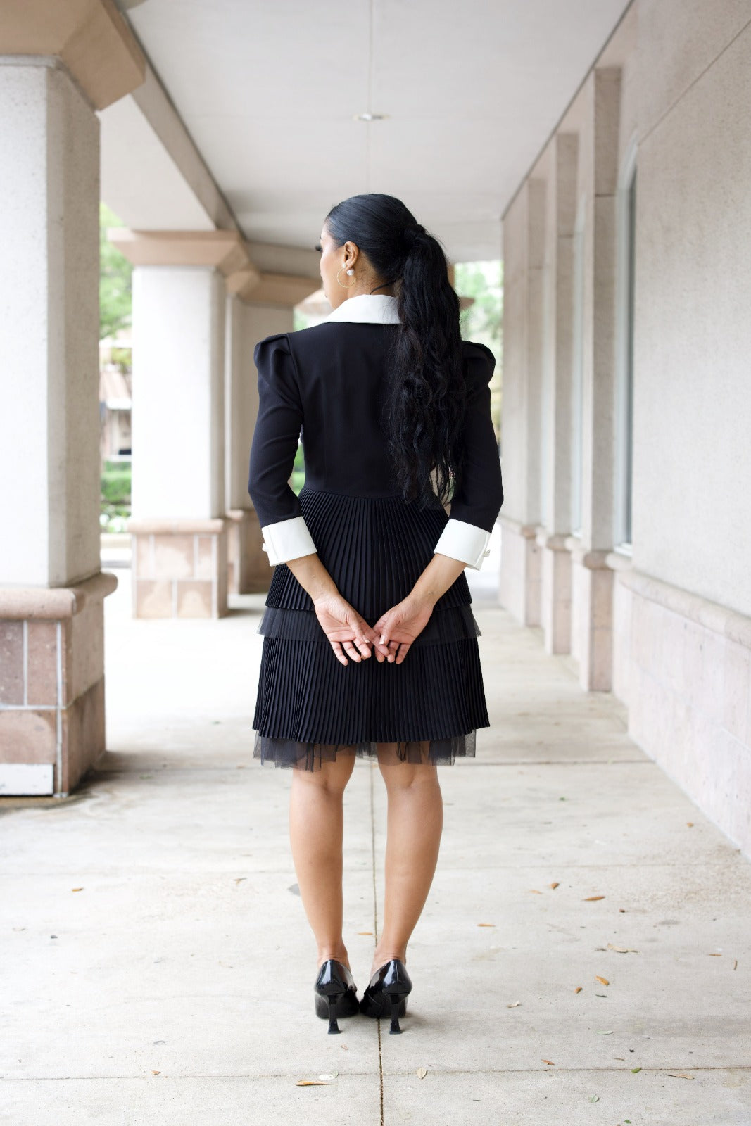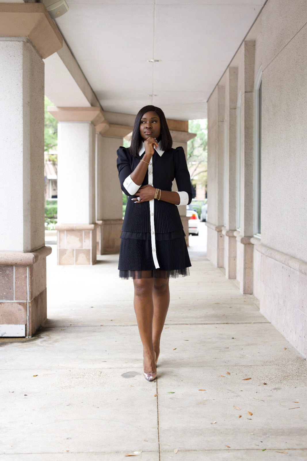 The Grezza Dress features a unique double step design and pleated construction, adding dimension and elegance to your style. With delicate tulle detailing and a buttoned front, this collared dress boasts contrast accents for a sophisticated touch. Elevate your wardrobe with this statement piece.