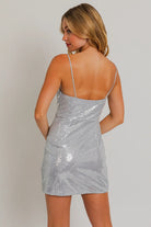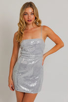 This silver sequin mini dress is must-have for any special occasion. The spaghetti straps add a touch of elegance, while the shimmering silver sequins create a glamorous look. Its figure-hugging silhouette accentuates your curves, making you feel confident and stunning. Complete your wardrobe with this versatile and eye-catching piece.