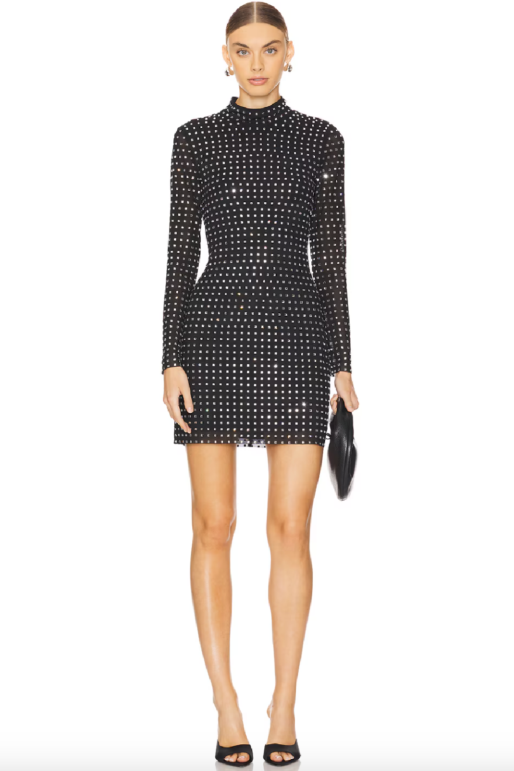 Elevate your style with our KRISTA dress. This long-sleeved mini dress features a mock neck and back zipper closure. This stunning dress also features unique square-shaped rhinestone stud embellishments for a touch of glamour. Make a statement with this elegant and sophisticated piece, perfect for any occasion.
