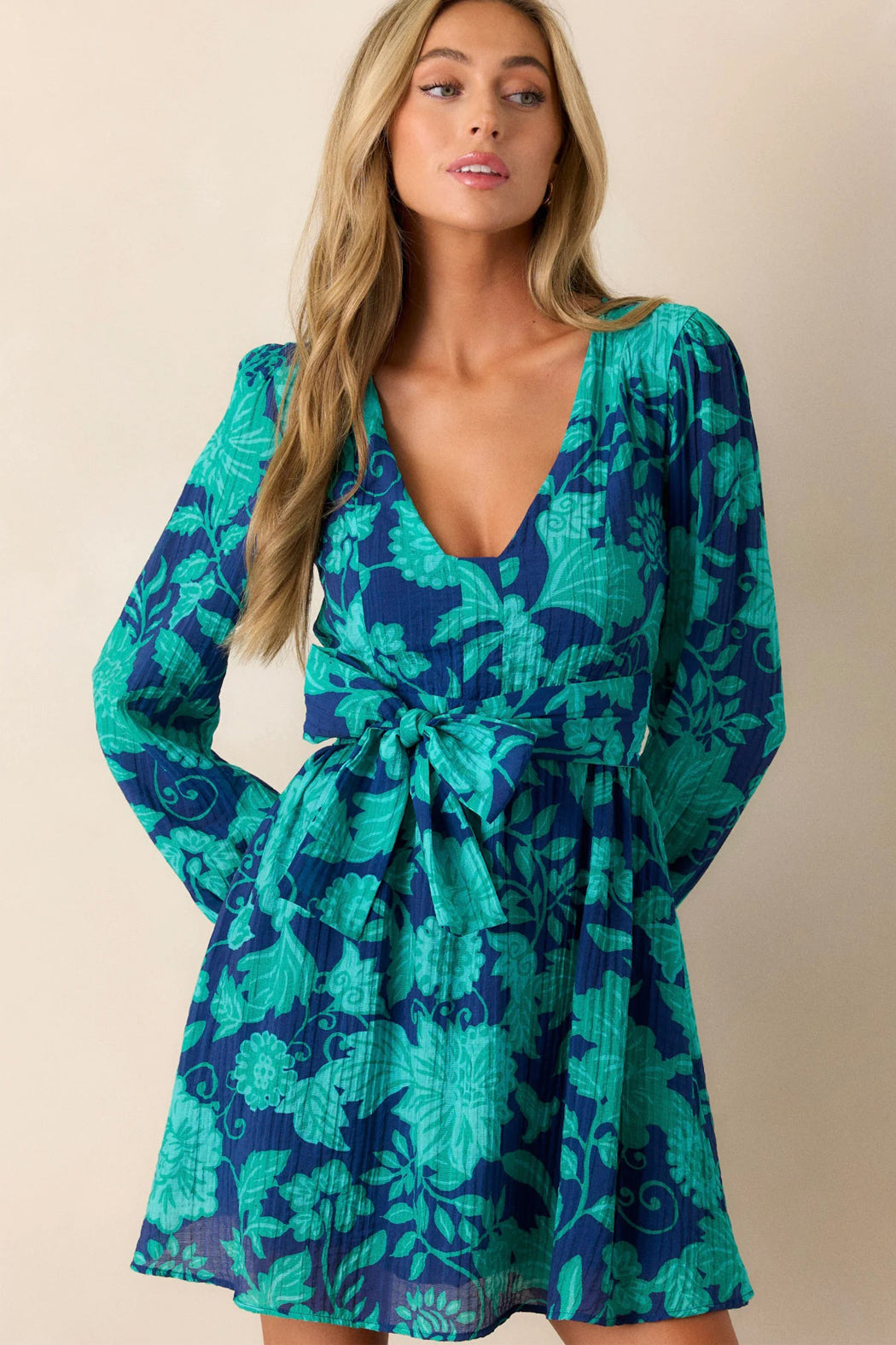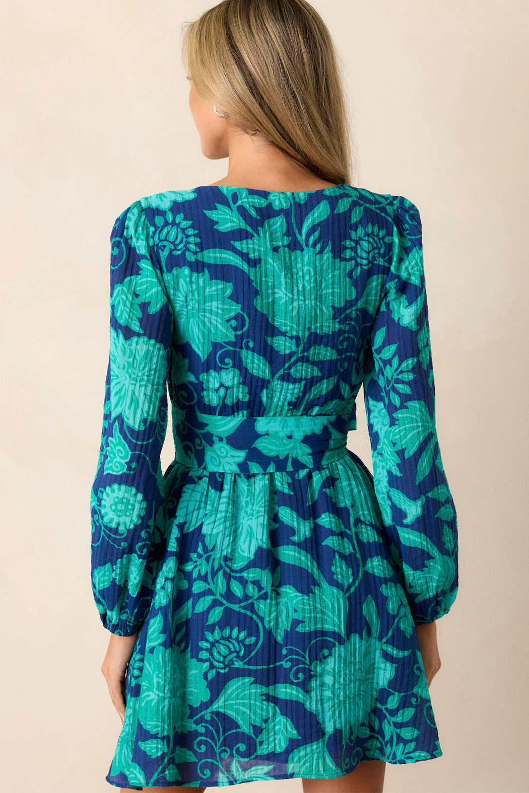 Perfect for any occasion, the Connie Dress in navy with a teal paisley inspired floral print features a v-neckline, long sleeves, and a thick tie waist. The subtle pleat texture elevates the look while the lining allows for ease of wear.