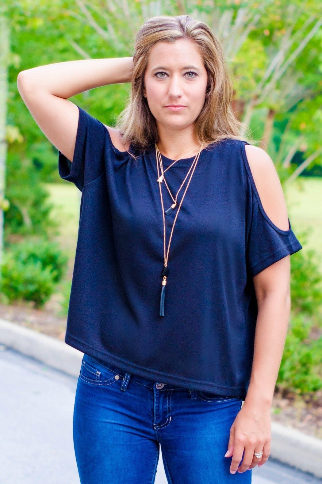 Take a little break from your plain and simple solid black tops and show a little skin in this hot and cold tee. It is still just as comfy, but will spice up your normal every day look (just a touch!). Jessica is 5'5" and is modeling a small. {Premiere Contemporary Sizing}