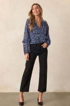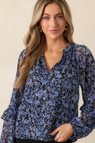 Elevate your everyday wardrobe with the Lucinda Blouse. The elegant midnight blue color and delicate floral pattern add a touch of sophistication, while the soft fabric ensures comfort. Perfect for both casual and dressy occasions, this blouse is a versatile must-have for your closet. This midnight blue blouse features a v-neckline, relaxed fit, beautiful ditsy floral pattern, long sleeves with ruffle detailing and elastic wrist cuffs.