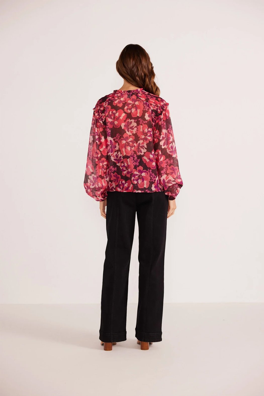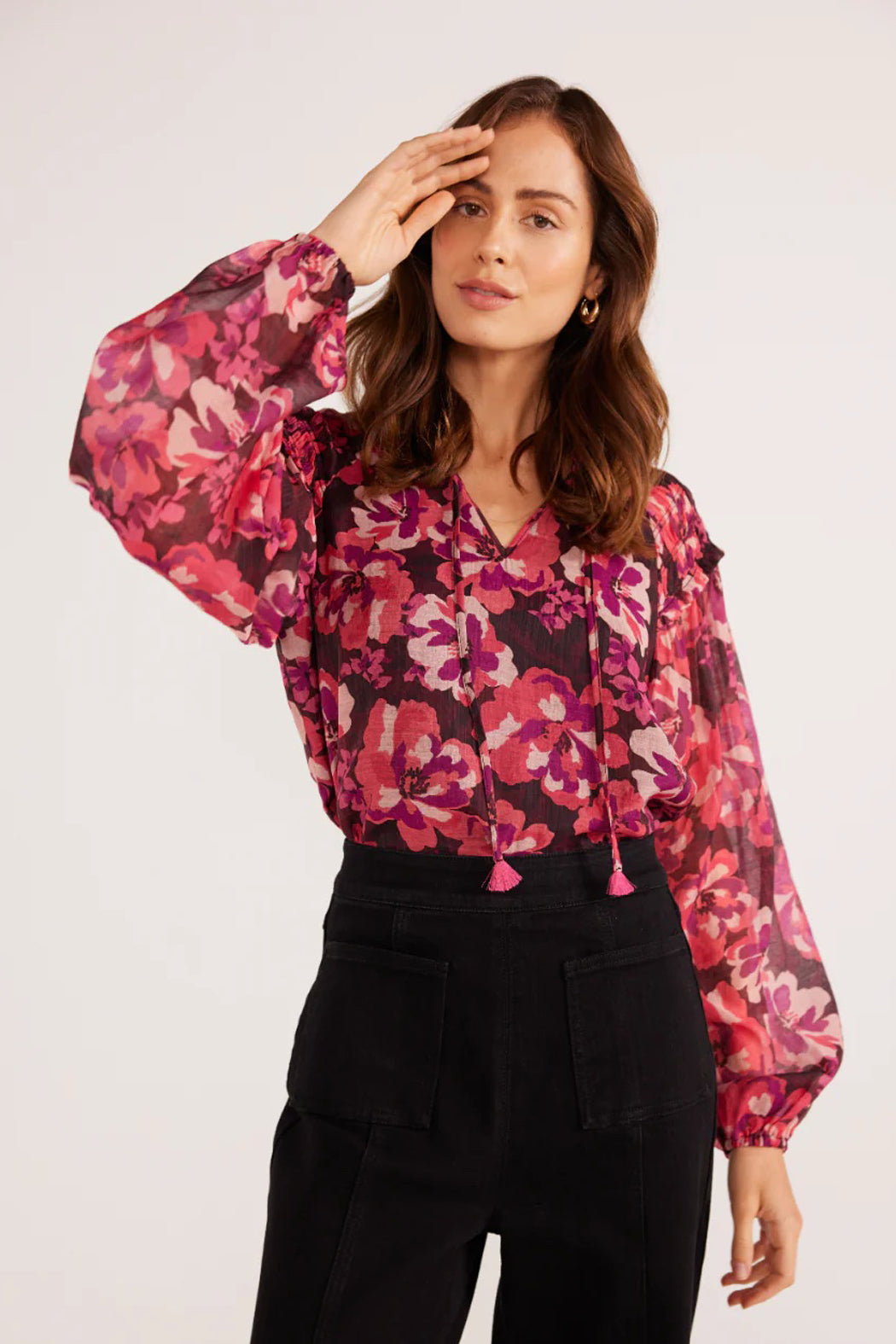 The Savannah Floral Blouse showcases a vibrant floral pattern in pink, purple, and burgundy, perfect for adding a touch of elegance to any outfit. Crafted from lightweight fabric, this blouse features a v-neckline with a delicate tie detail for versatile styling. The front of the bodice is lined for added comfort, while the breathable design makes it ideal for all-day wear. Pair with your favorite jeans or skirts for a polished yet effortless look. Follow @Lunaboutiquecanton on instagram and DM us with any questions :)