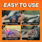 - SAY GOODBYE TO GLUE PROBLEMS. Tired of dealing with traditional super glue drying out or sticking to your skin and clothes? Bondic's UV plastic repair kit stays liquid until cured by UV light, eliminating the risk of drying out in the container or welding your fingers together.