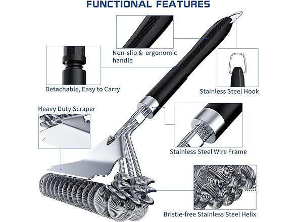 - Time-saving & Efficient Grill Brushes: Grill cleaning brush has a built-in wide scraper for powerful scraping of greasy stains. The 3-in-1 grill bristles can wrap the grill better and more, and the spiral can easily reach and clean the sides of the grill. Cleaning efficiency is 5 times faster than ordinary grill brushes, saving you precious time.
