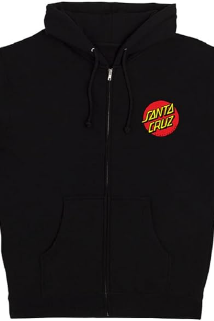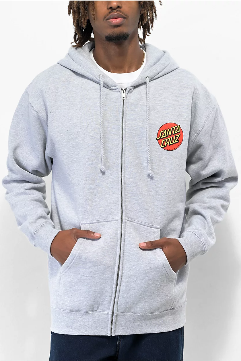 In a cozy grey colorway comes the Classic Dot zip hoodie from Santa Cruz, showing branding left of chest with a screen-printed logo in accents of red and yellow for a touch of color; seen on the back as well but expanded for all to see. This zip up hooded sweatshirt features an adjustable drawstring hood for a snug fit, and comes complete with dual front slash hand pockets for storing on hand goods.