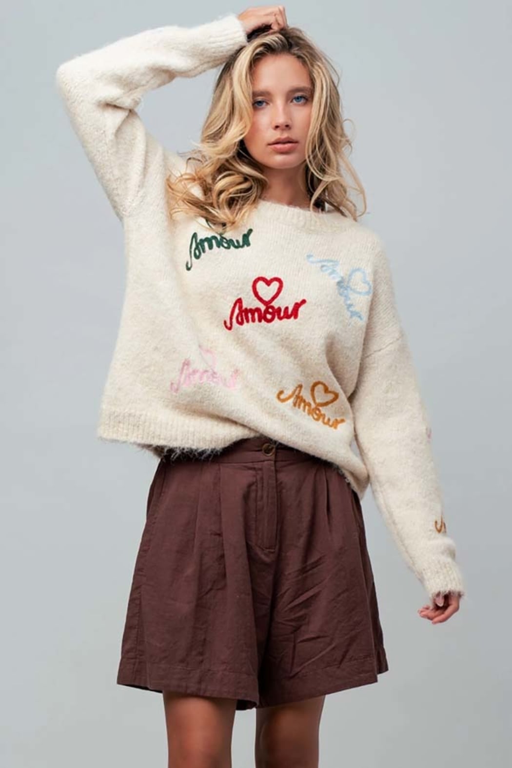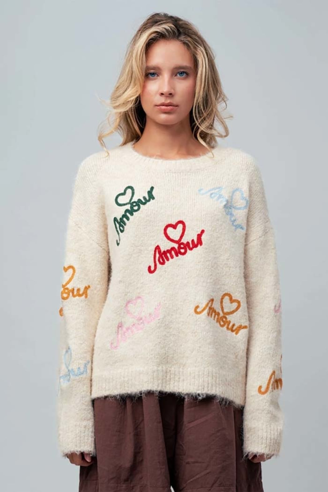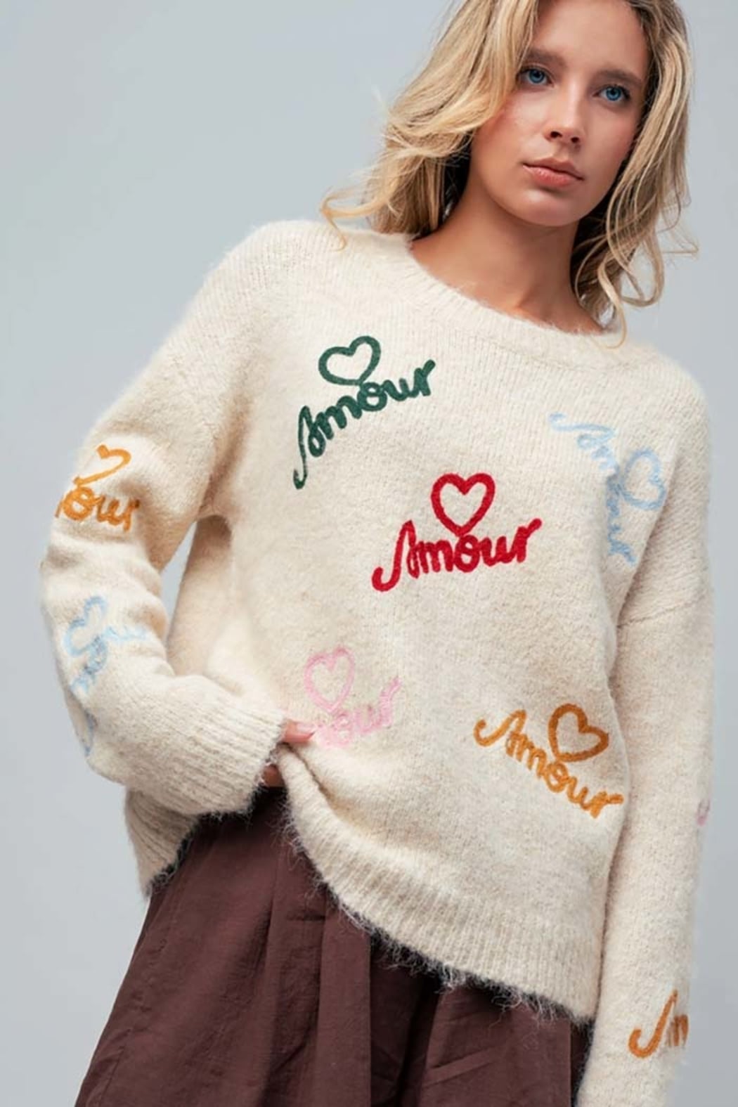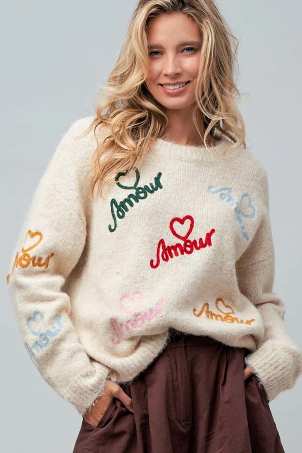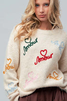 Amour Embroidered Fuzzy Knit Sweater Soft, playful, and irresistibly cozy, this fuzzy knit sweater brings romantic charm to everyday dressing. Designed with a classic crew neckline, this relaxed-fit sweater features colorful “Amour” embroidery scattered throughout, each accented with delicate heart details for a whimsical, statement-making finish. The fluffy knit texture adds warmth and softness, while ribbed trim at the neckline, cuffs, and hem keeps the look polished and wearable. Effortlessly styled with denim, trousers, or skirts, this sweater is perfect for cozy days that still call for personality and charm. Details Relaxed fit Classic crew neckline Colorful “Amour” embroidery with heart accents Long sleeves Soft fuzzy knit texture Ribbed neckline, cuffs, and hem Easy, everyday silhouette Fabric & Care 70% Polyester, 21% Nylon, 8% Wool, 1% Spandex Hand wash cold, hang dry Made in China Model is 5' 7" and wearing a Small. amour sweater, embroidered heart sweater, fuzzy knit sweater women, crew neck sweater women, cozy knit sweater, romantic sweater top, boutique knit sweater, relaxed fit sweater Amour Embroidered Fuzzy Knit Sweater | Women’s Crew Neck Sweater Shop the Amour Embroidered Fuzzy Knit Sweater featuring a classic crew neckline, colorful heart embroidery, soft fluffy knit texture, and a relaxed fit. Cozy, playful, and boutique chic.