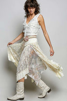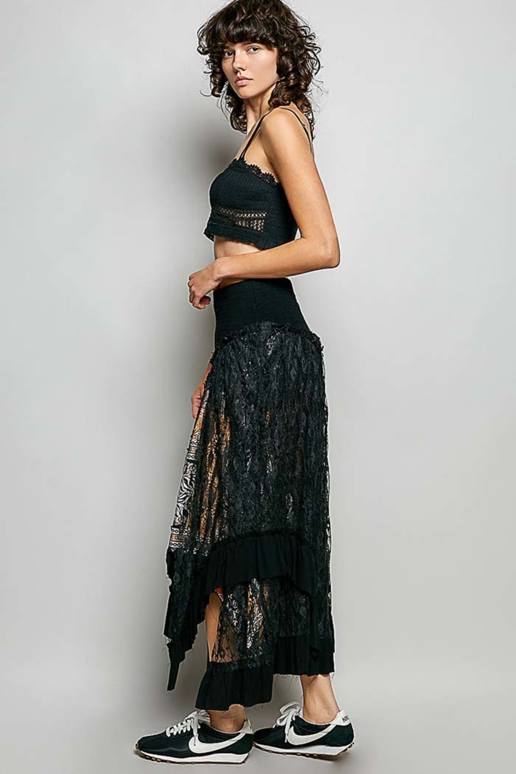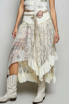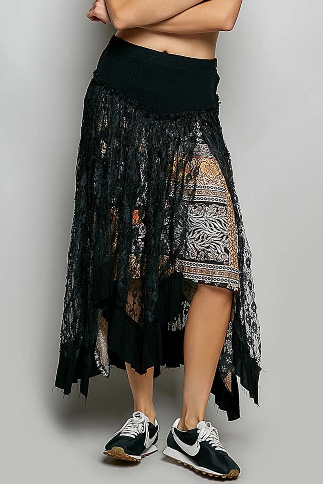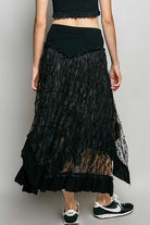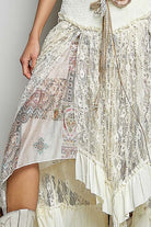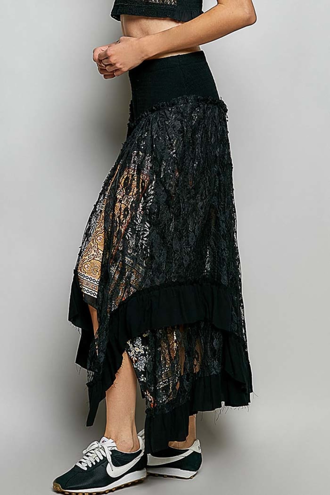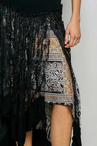 A romantic statement piece with effortless movement, this flowing lace skirt blends feminine texture with modern edge. Designed with a comfortable smocked waistband and dramatic high-low hem, it features delicate lace overlay, soft ruffle accents, and a printed lining that adds depth and dimension. Light, airy, and full of flow, this skirt moves beautifully with every step.