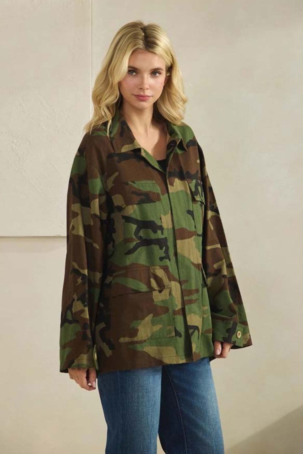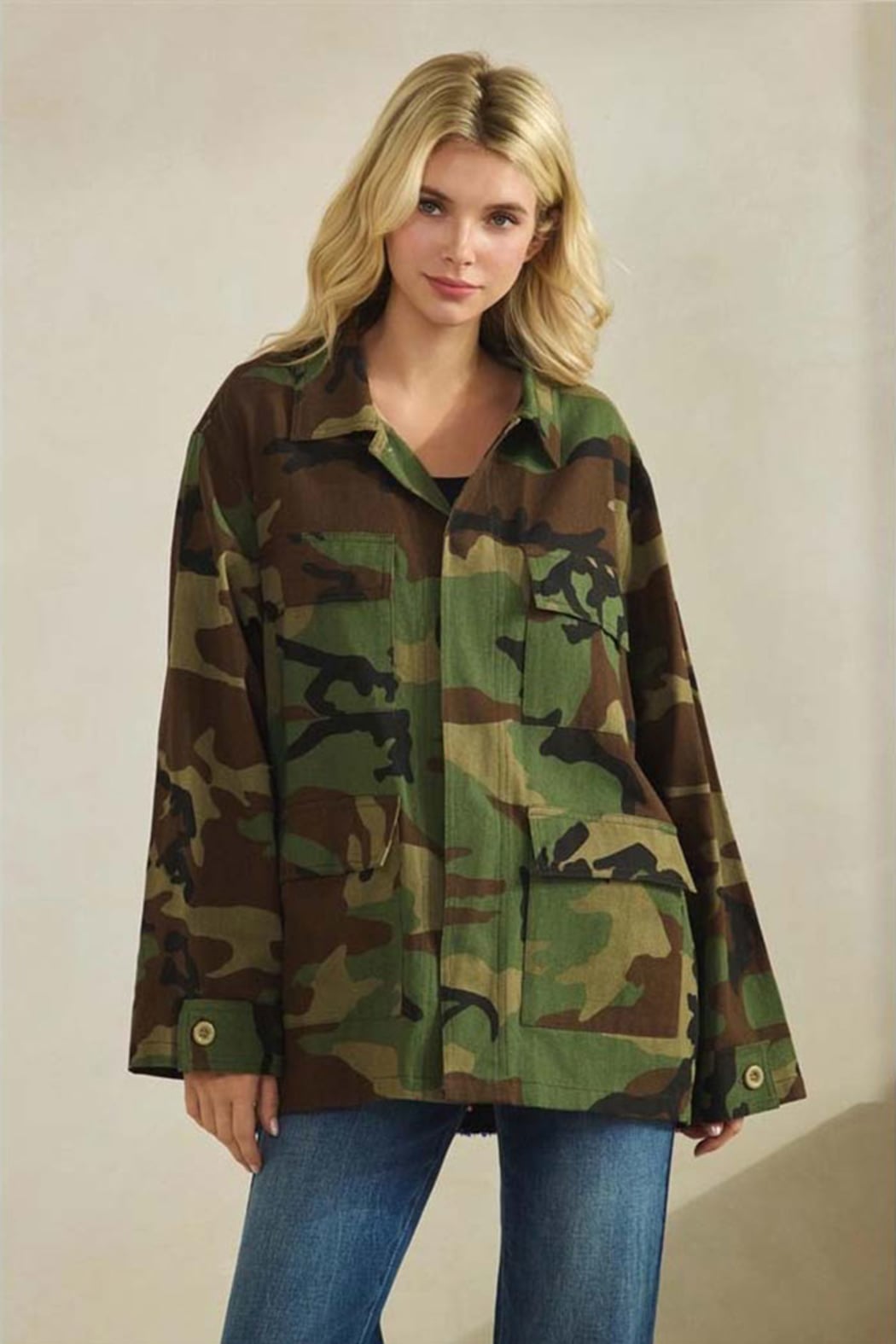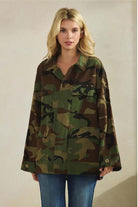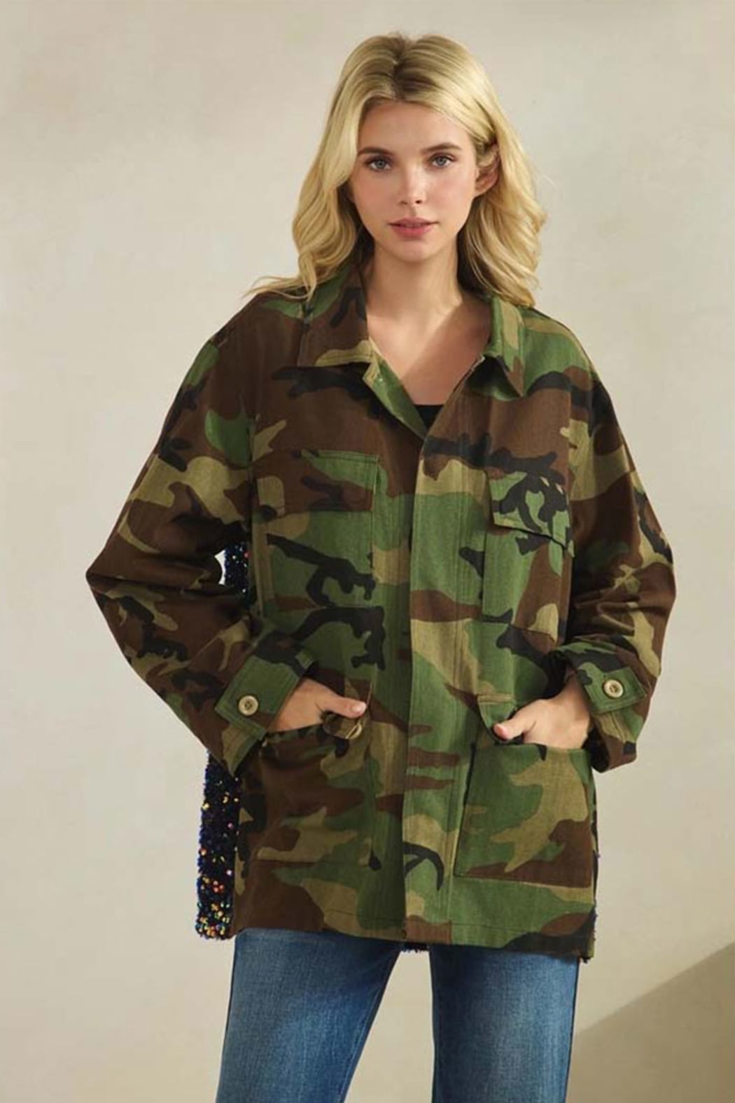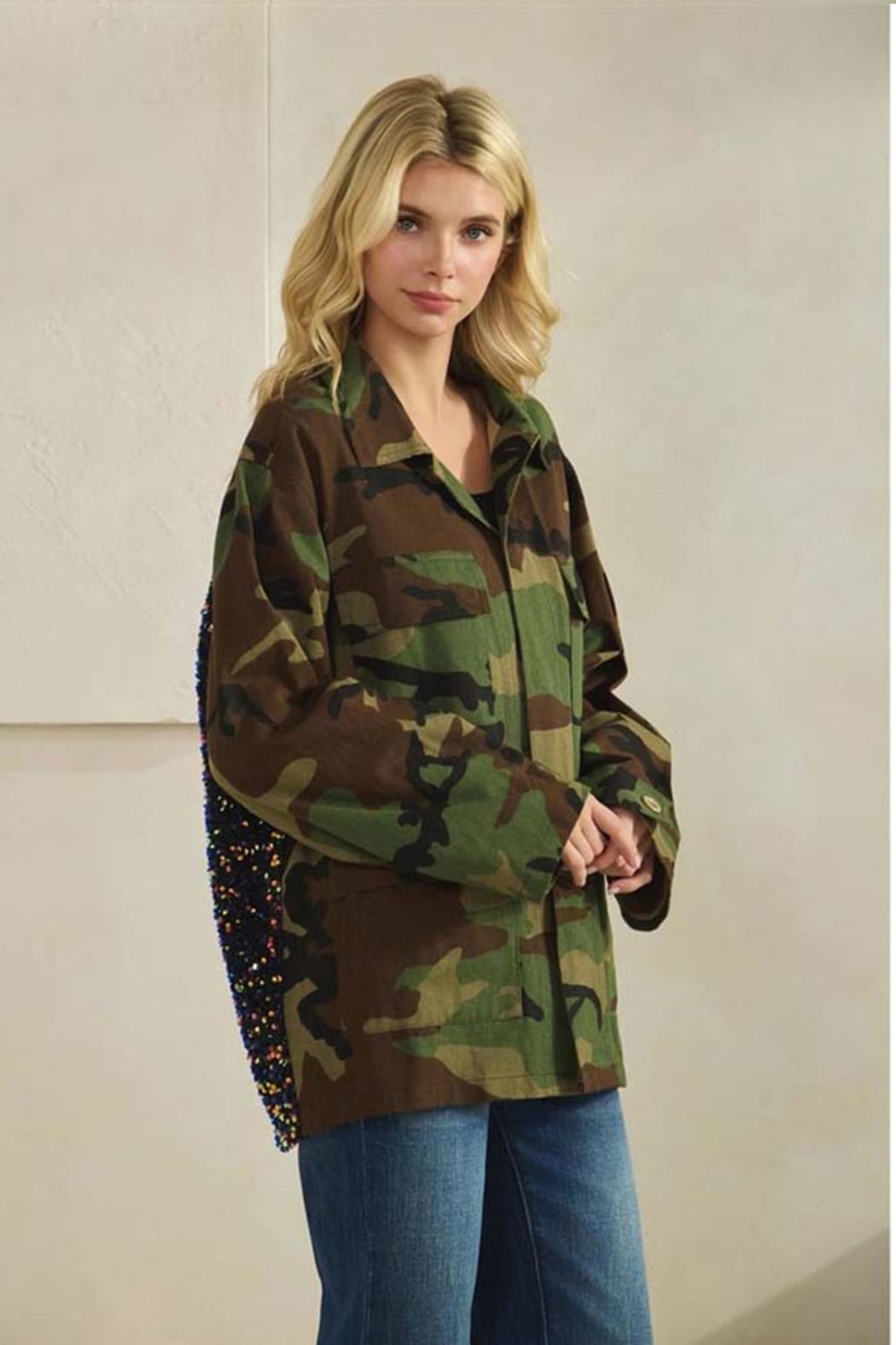 Camo Sequin Back Statement Jacket Utility meets sparkle in this standout camo jacket designed to turn heads from every angle. Featuring a classic collared neckline, this relaxed-fit jacket delivers an effortless, laid-back front with a bold surprise in back — a shimmering sequin contrast panel that elevates the rugged camo print into true boutique statement territory. The structured yet easy silhouette makes it perfect for layering over tees, tanks, or lightweight knits, while the back sequin detail adds just the right amount of edge and shine. This jacket is the definition of casual cool with a luxe twist — understated from the front, unforgettable from the back. Details Relaxed fit Classic collared neckline Long sleeves Button-front closure Front patch pockets Allover camo print Sequin contrast back panel Statement jacket with mixed textures Fabric & Care Hand wash cold, hang dry Made in China Model is 5' 7" wearing Small camo jacket women, sequin back jacket, statement camo jacket, collared utility jacket, boutique camo jacket, mixed media jacket women, casual chic jacket Camo Jacket with Sequin Back | Women’s Statement Jacket Shop this camo jacket featuring a classic collared neckline, relaxed fit, and bold sequin contrast back. A statement utility jacket with effortless edge and boutique style.