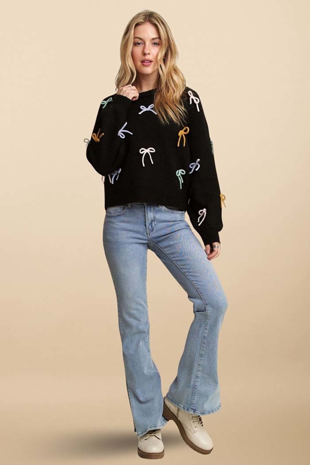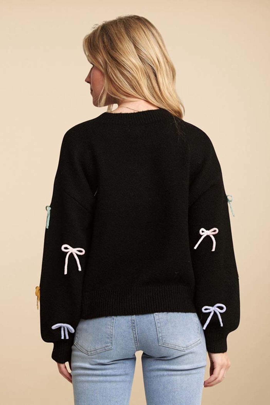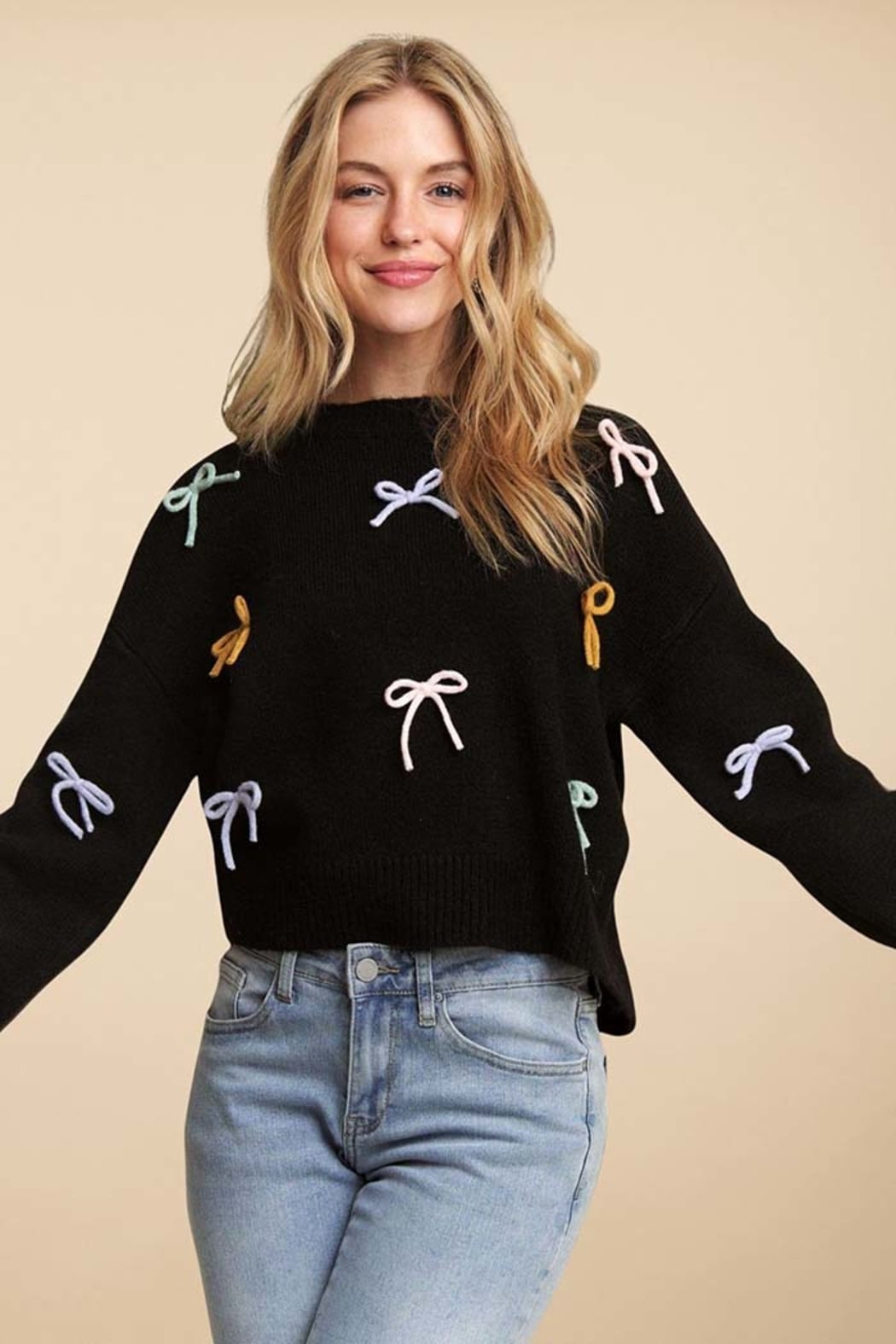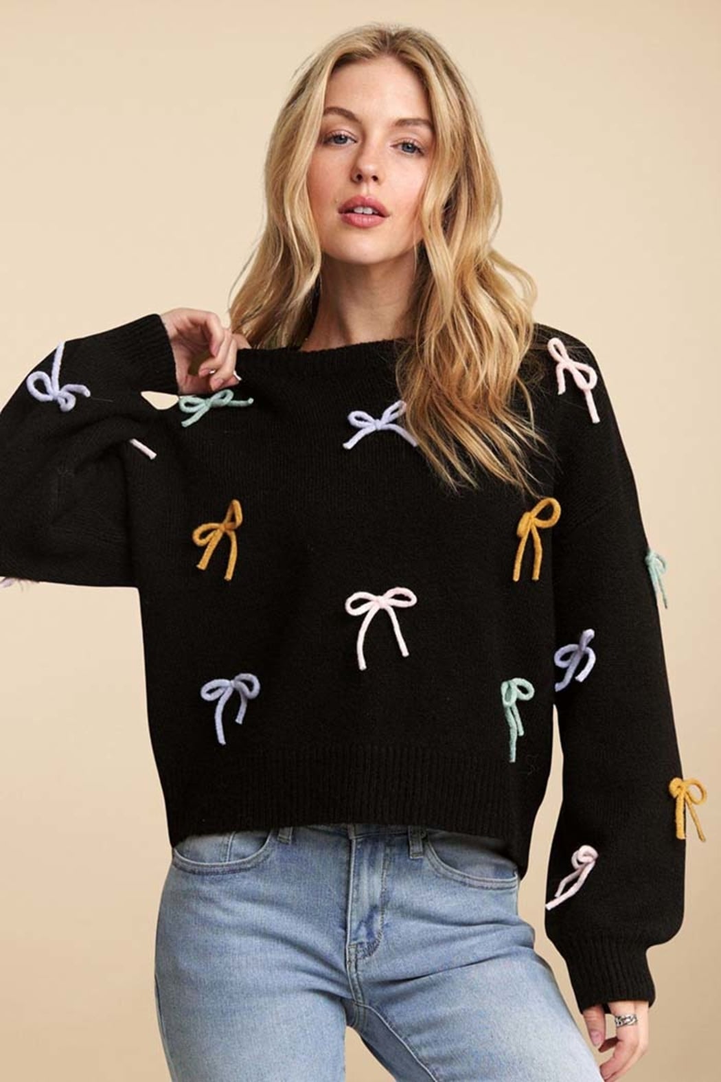 Bring a playful twist to your winter wardrobe with this irresistibly charming bow-accent sweater. Designed for everyday comfort with a soft, cozy hand-feel, this piece combines a relaxed silhouette with whimsical multicolor bow detailing. Easy to dress up or down, it adds a sweet, cheerful touch to any look—perfect for casual outings, coffee runs, or cozy weekends.