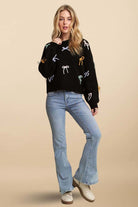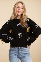 Bow sweater, cutesy sweater top, black bow knit, multicolor bow sweater, playful winter sweater, cozy cute knit top, soft sweater for women, trendy bow accent sweater, adorable fall winter top, feminine casual knitwear