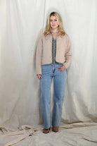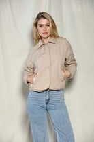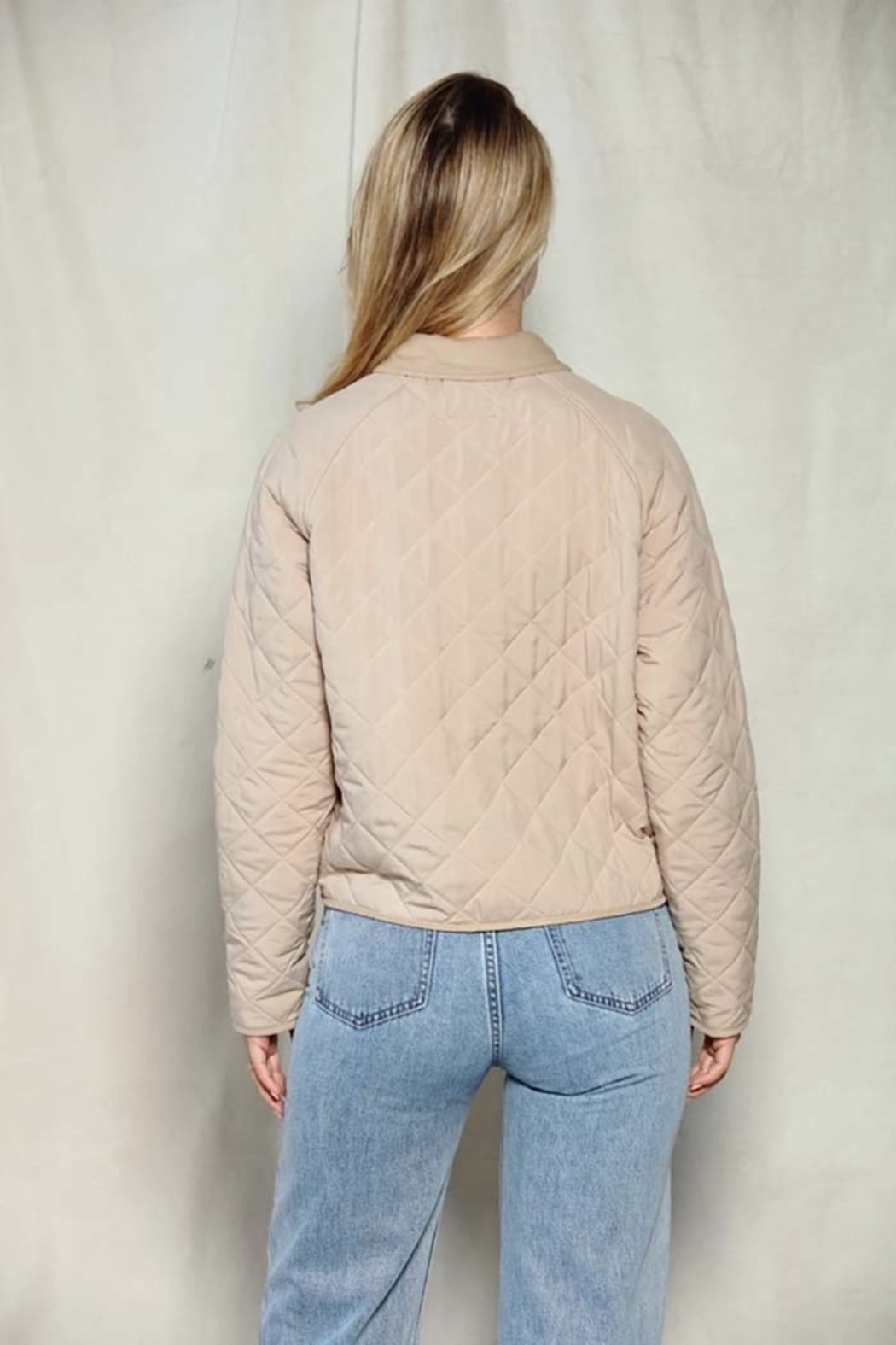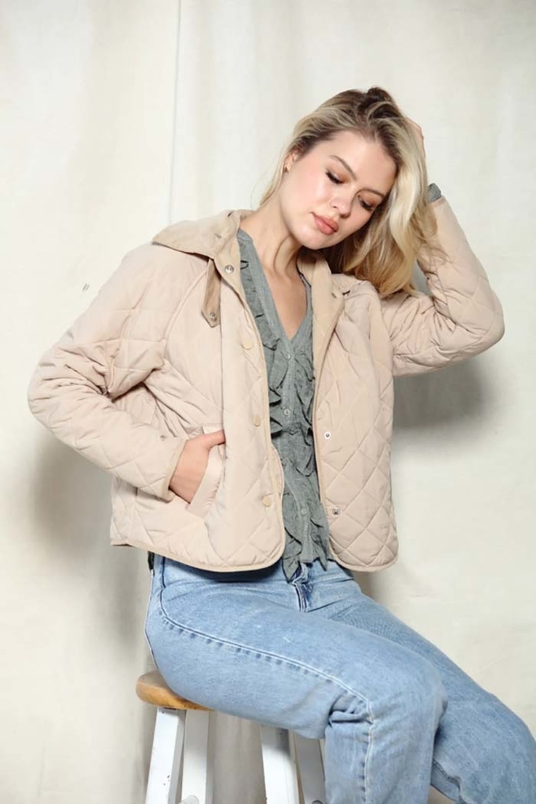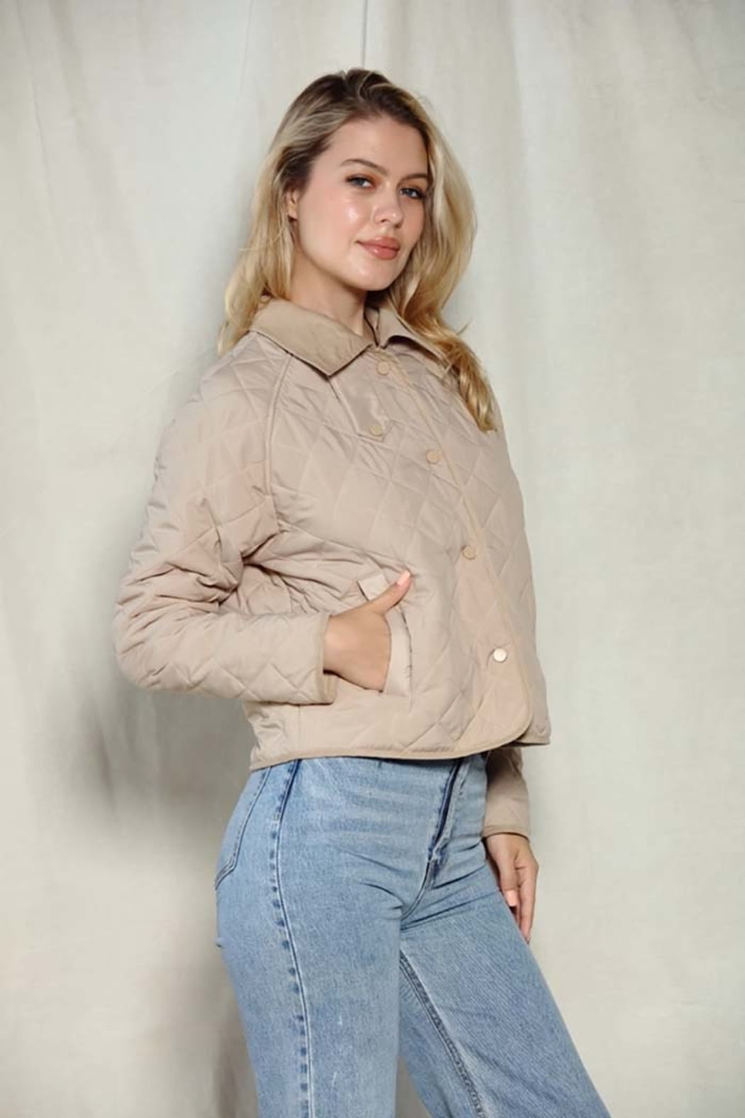 Diamond Quilted Barn Jacket This diamond quilted barn jacket delivers cozy warmth with a clean, timeless silhouette. Designed for effortless everyday layering, it features a soft corduroy collar that adds subtle texture and contrast. The lightweight quilted construction offers comfortable insulation without bulk, while the snap-button front and functional side pockets keep the look practical and polished. Finished with a flattering waist-length cut, this jacket pairs easily with denim, knits, and fall staples. Details Regular fit Waist-length silhouette Diamond quilted texture Soft corduroy collar Snap-button front closure Side pockets Lightweight yet warm feel Fabric & Care 100% Polyester Hand wash cold, hang dry Made in China Model Info Model is 5'9" and wearing a size Small Bust: approximately 46" Length: approximately 23.5" diamond quilted barn jacket, women’s barn jacket, corduroy collar jacket, quilted barn coat women, beige quilted jacket, fall outerwear women, lightweight quilted jacket, casual barn jacket, everyday layering jacket Diamond Quilted Barn Jacket | Corduroy Collar Women’s Outerwear Shop the Diamond Quilted Barn Jacket featuring a soft corduroy collar, lightweight warmth, snap-button front, and easy everyday fit. Perfect for fall layering.