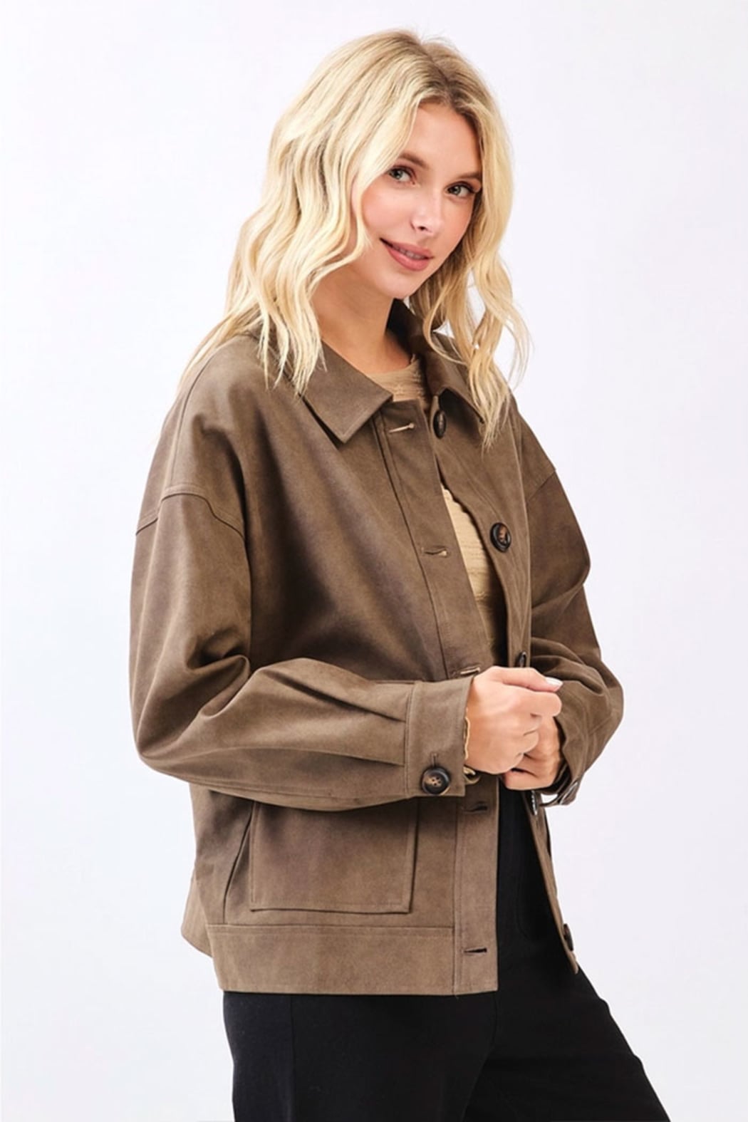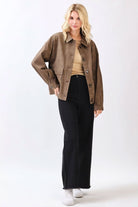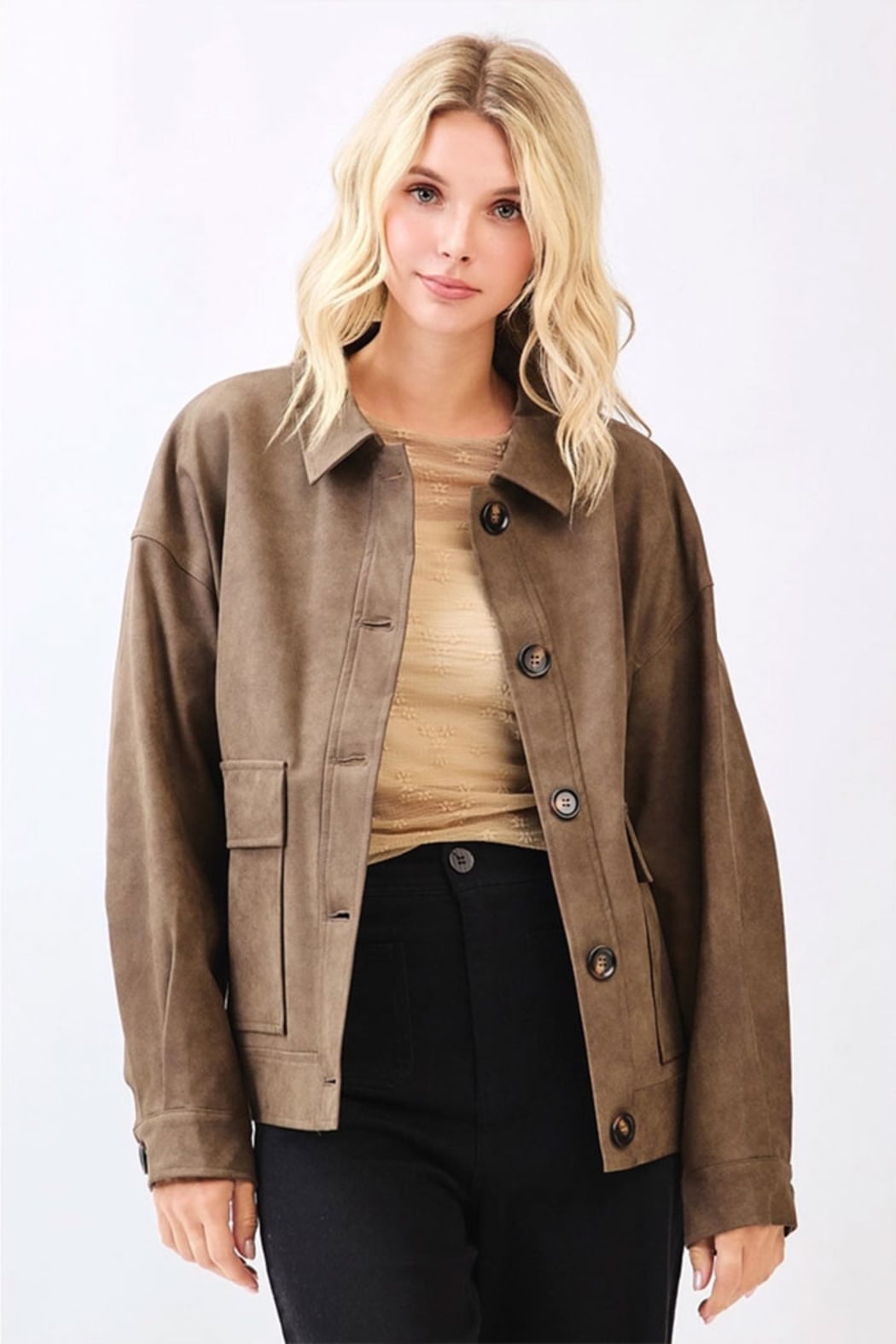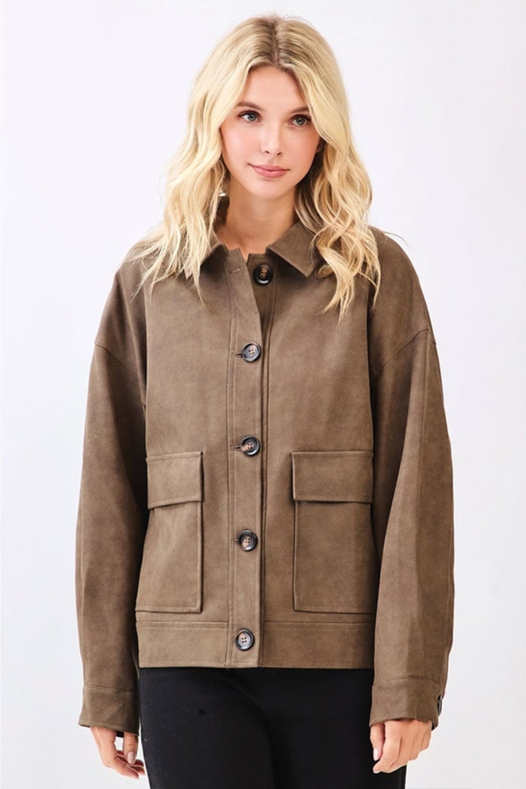 This faux leather utility jacket delivers a modern, relaxed take on classic outerwear. Designed with a smooth faux leather finish, it features a timeless collar, button-front closure, and functional flap patch pockets for an effortless, everyday look. The drop-shoulder silhouette and relaxed fit add comfort and ease, while the fully lined interior provides lightweight structure and wearability. Finished at the waist, this jacket layers beautifully over tops and knits for a polished yet casual outfit.