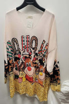 Italian-made cream deer Christmas sweater featuring a festive holiday design and relaxed one-size fit. Soft stretch knit perfect for cozy seasonal styling.