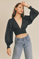 Crop Top V-neck Cinching at wrists Silky Waist elastic band Model Measurements Model wears a size small Fabric: 100% Polyester