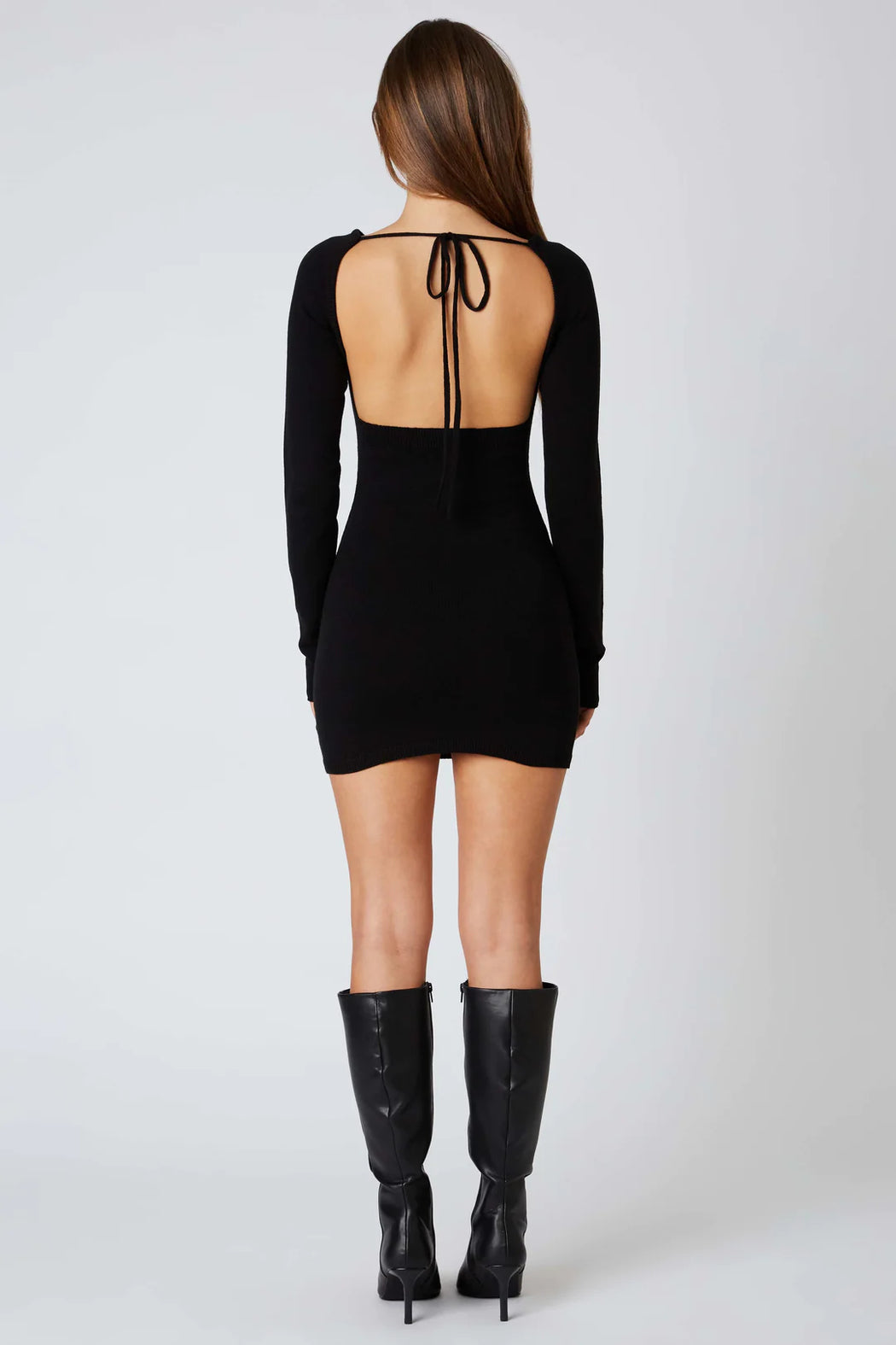 Knit long-sleeved mini dress with an open back.