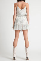 The Marquise ruffle mini skirt has a wrap effect, cut from a fil coupe silver metallic silver thread. Style with the matching tank top for the best night out look!