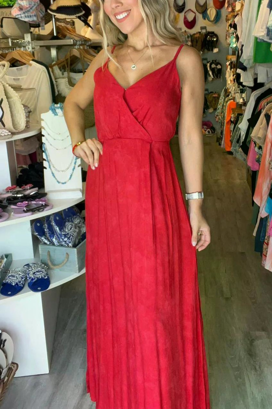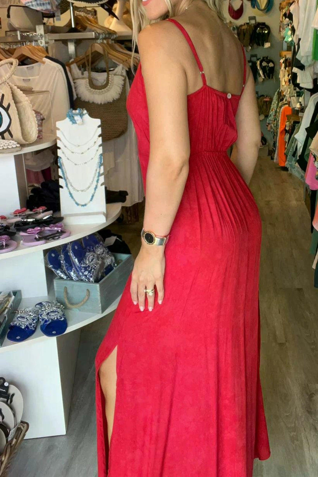 Our Bridesmaid Maxi Red Dress Mohana commands attention! This stunning piece features adjustable spaghetti straps, front wrap top and elastic waist to perfectly fit your body. A knee high side slit adds an alluring touch to elevate the look. All crafted in our exclusive soft balinese rayon. This beauty will steal your heart!