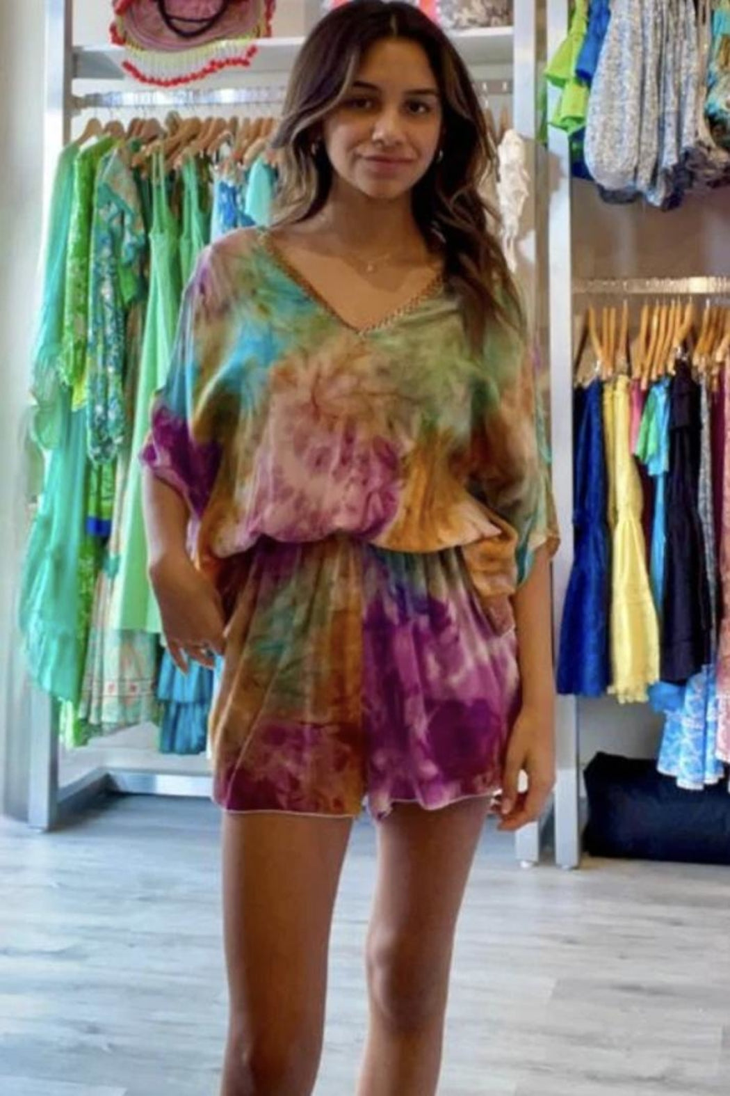 Romper V Neck beaded neckline wide sleeves elastic waist front pockets
