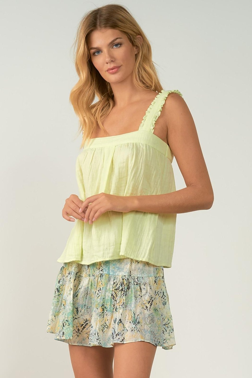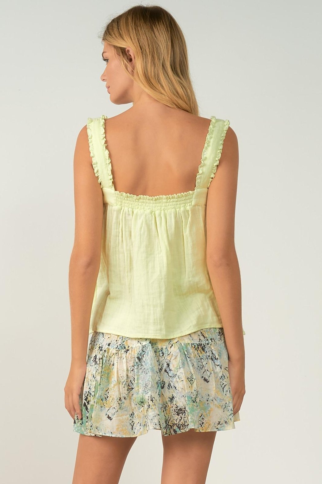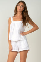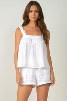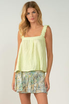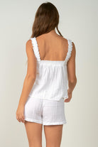 Soft Flowy Gauzy White Ruffled Strap Tank Top. Super cute with shorts or dress it up with a skirt and heels. Model is wearing a size small