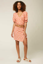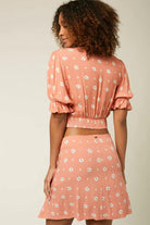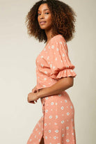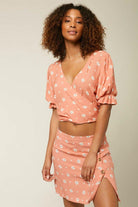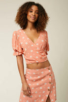 A casual woven top that has a front wrap design, encased elastic at the sleeves and allover floral print.