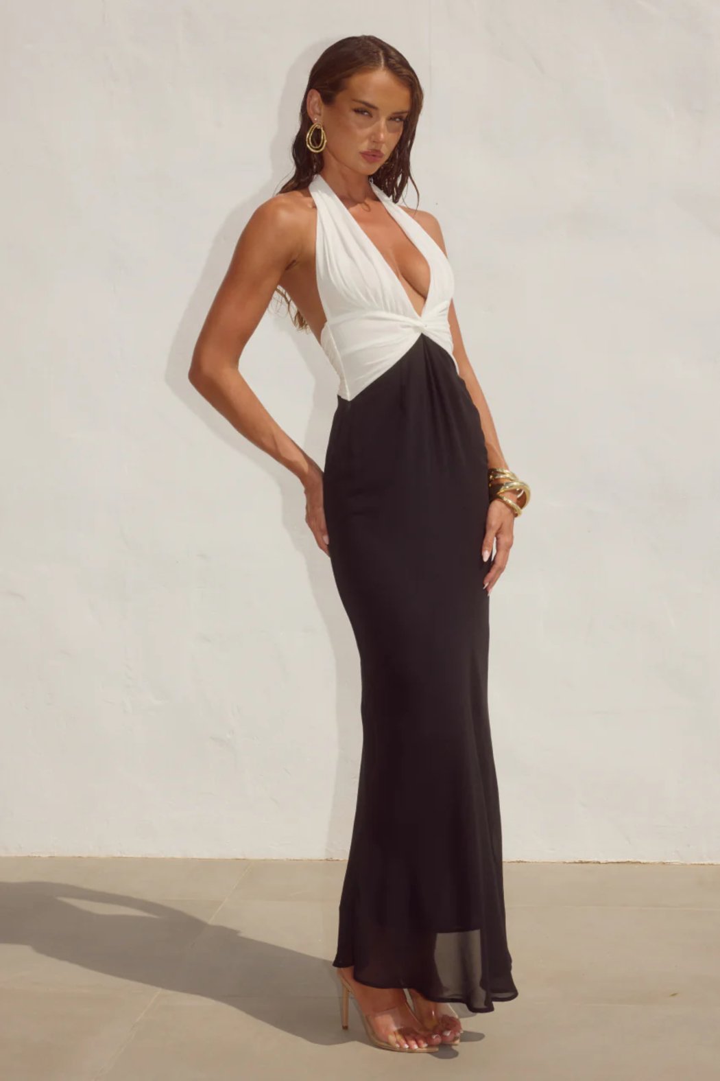 The Tenaya Plunge V Neck Maxi Dress combines elegance with modern sophistication. This floor-length gown features a dramatic deep V neckline and striking open back design, perfect for formal occasions. The halter neck provides secure support while the twisted waist detail adds refined dimension. A center back invisible zipper ensures a seamless silhouette. Crafted from 100% polyester with a structured lining, this semi-sheer piece delivers timeless appeal with contemporary flair.