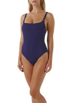 For those who favor classic swimwear, the Tosca Swimsuit is a holiday staple. In a sleek navy hue, the style is crafted from luxe ribbed swim fabric with added SPF 50+ protection. The streamlined silhouette features removable pads and a scooped back. Understated yet elegant, its minimal design is enhanced with signature gold ring trims connecting the slim, fixed straps. Its appeal lies in its versatility, making it ideal for active days on the beach, or relaxed days sunbathing on deck.