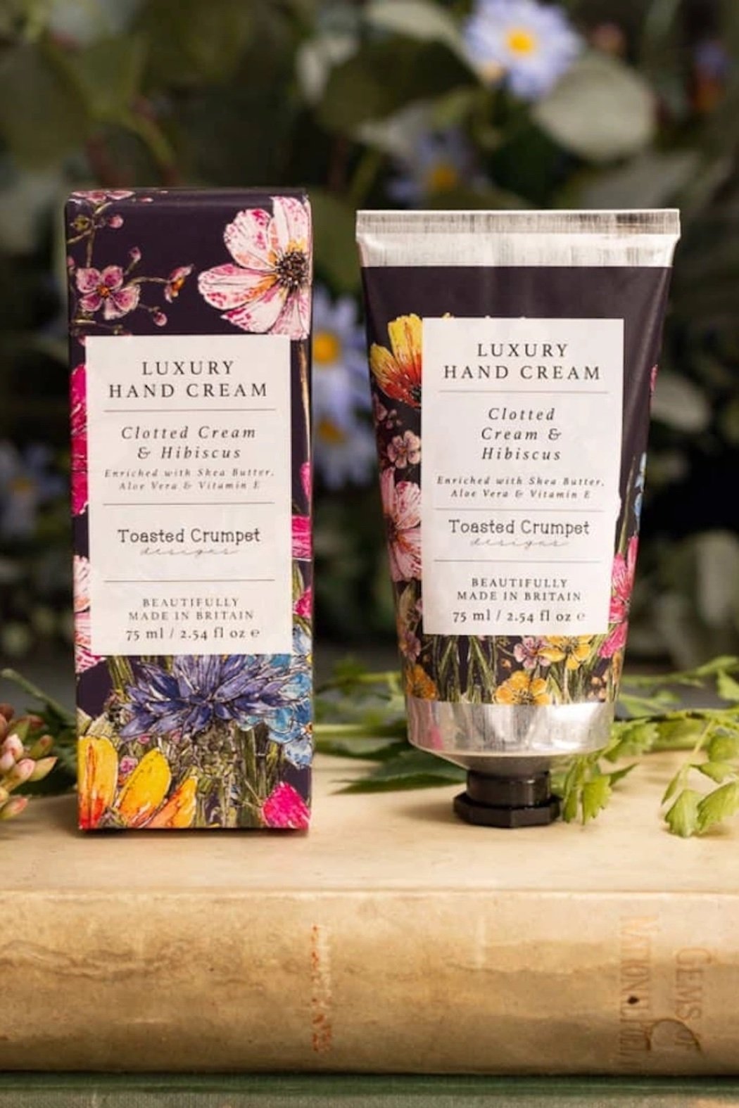 A delightful floral aroma of clotted cream and hibiscus combine to create a sumptuous creamy aroma which emits as you massage the hand cream into your skin. Its reminiscent of sunny days walking through a gorgeous flower garden. This tube holds 75ml of hand cream, making it the perfect size to keep on your desk or pop in your travel bag for on-the-go hand nourishment. It is beautifully presented inside a matching gift box which features a hand illustrated design of colourful flowers, captured in pink, yellow and blues. This is all set against a purple background.