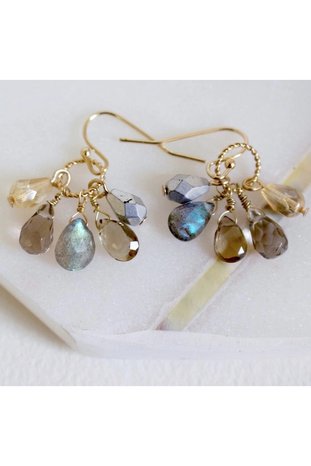 Beautiful mix of semi-precious stones, hand wire wrapped. Gold vermeil fish hook approx. 1 in. long