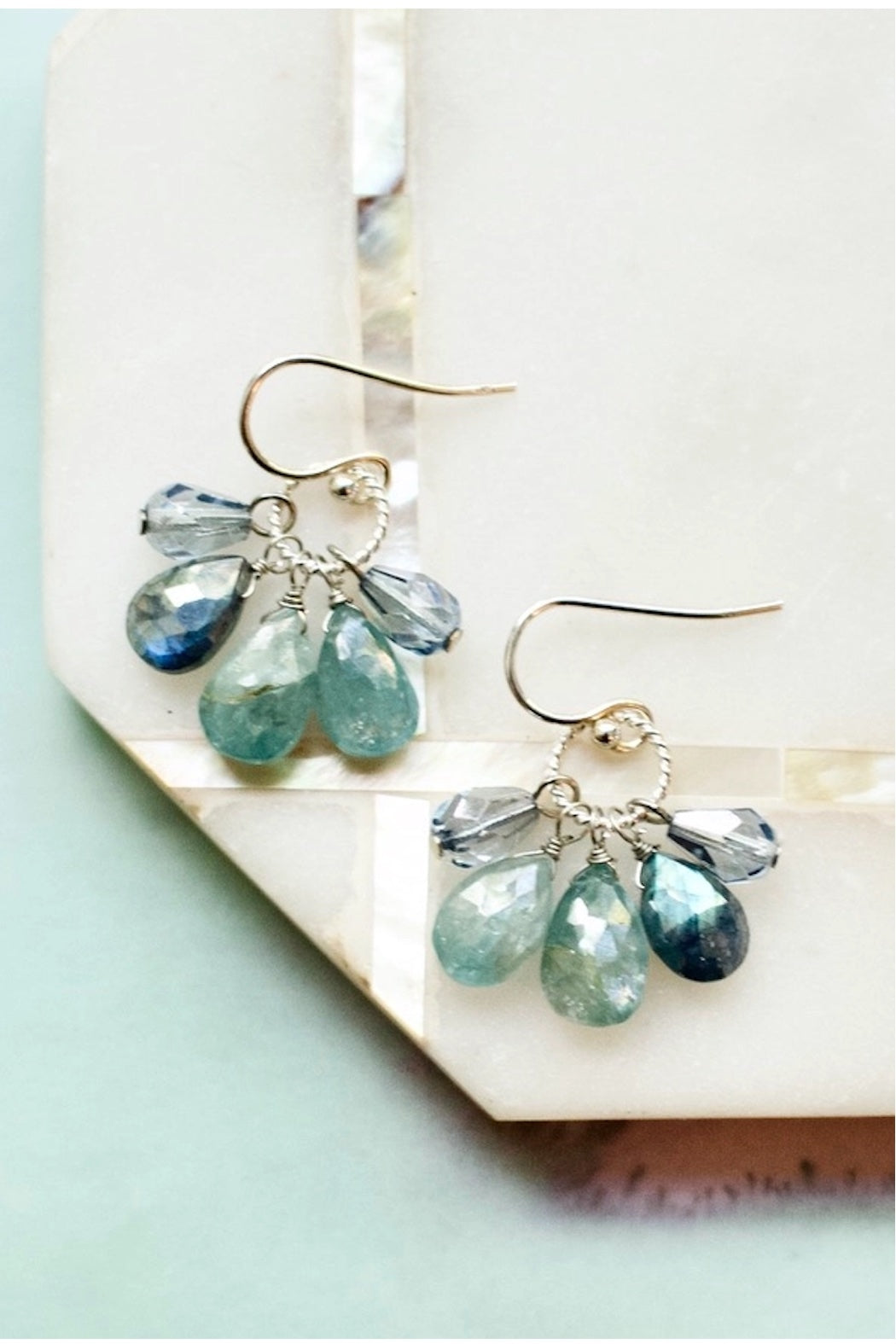 Beautiful mix of semi-precious stones, hand wire wrapped. Silver fish hook approx. 1 in. long