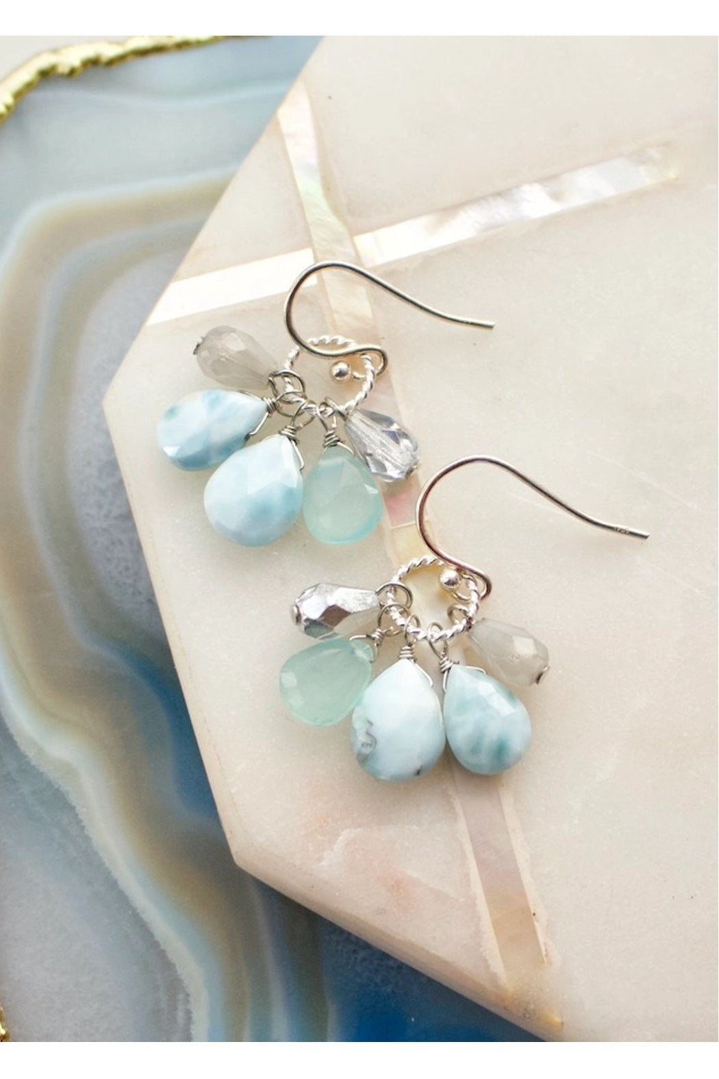 Larimar and semi-precious stones, hand wire wrapped. Silver fish hook approx. 1 in. long