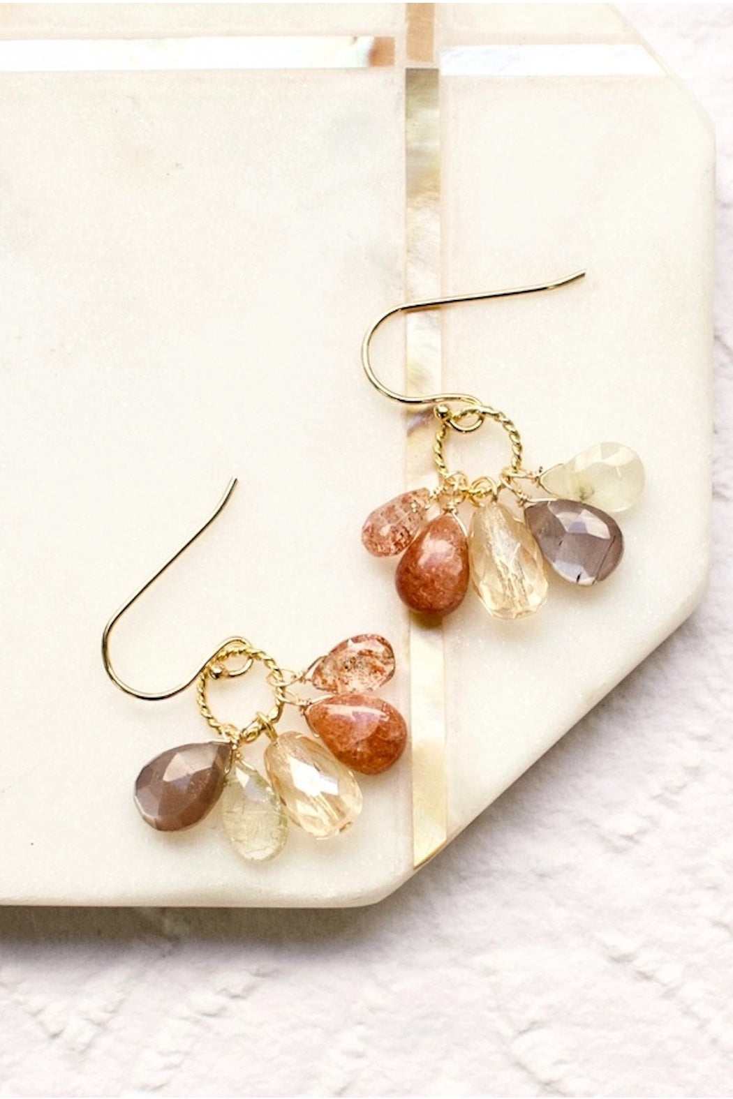 Beautiful mix of semi-precious stones, hand wire wrapped. Gold vermeil fish hook approx. 1 in. long