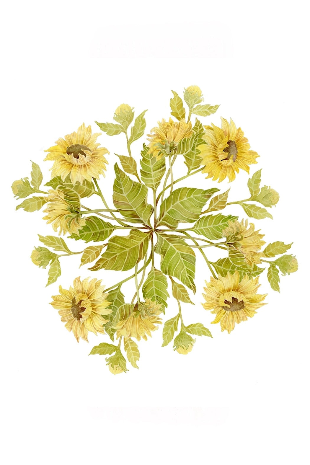 This intricate fine art print showcases spiraling sunflower blooms in warm yellows and soft greens.