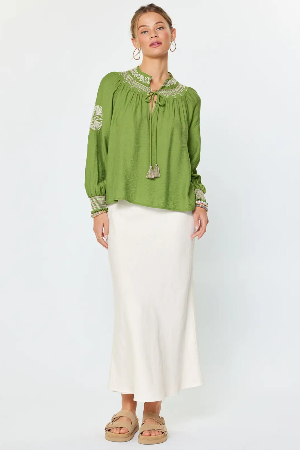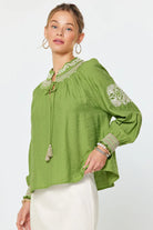 Lightweight, embroidered blouse with a boho-forward silhouette featuring a gathered yoke, tassel ties and smocked cuffs. The Boho Embroidered Long-Sleeve Blouse from Current Air is cut from a breezy textured woven that drapes softly over the body. Wear it tucked into a skirt or with denim for relaxed weekend styling; the high neckline and keyhole tie add artisanal detail. This long-sleeve blouse reads casual with an elevated, handcrafted look.