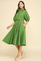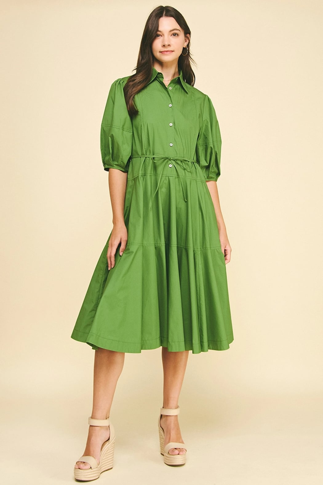 This Button Down Tiered Midi Dress is a feminine, shirt-style midi with a tiered skirt and puffed mid-length sleeves for a relaxed yet polished silhouette. Pinch designed it with a button-front bodice, a self-tie waist, and roomy pockets that make it effortlessly wearable. The lightweight woven fabric and midi length make it ideal for casual days, weekend outings, or dressed-up daytime events.