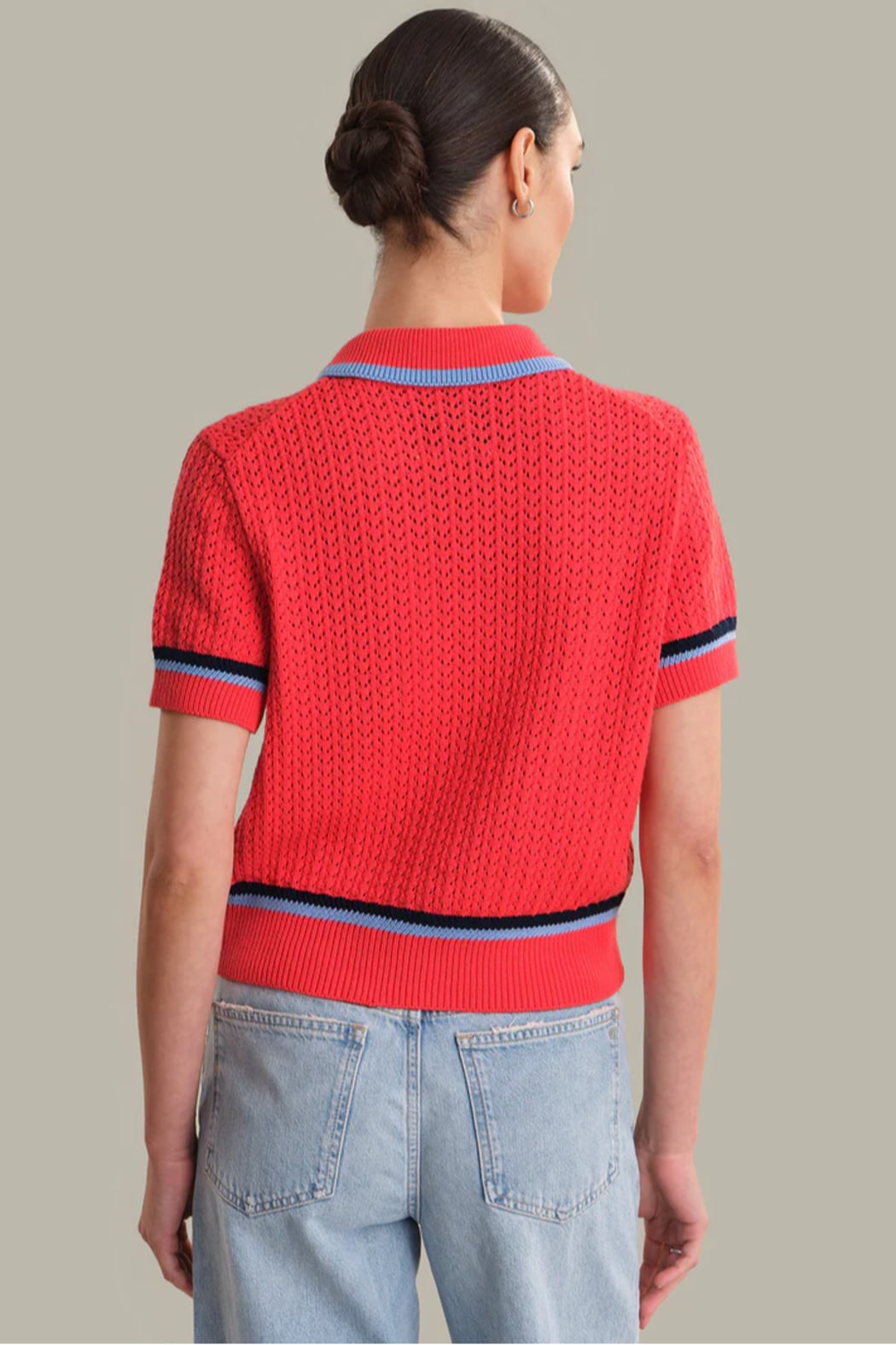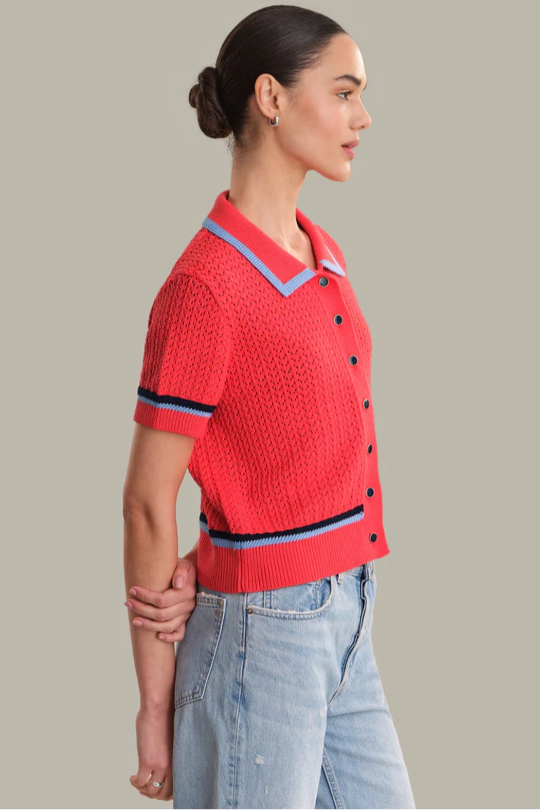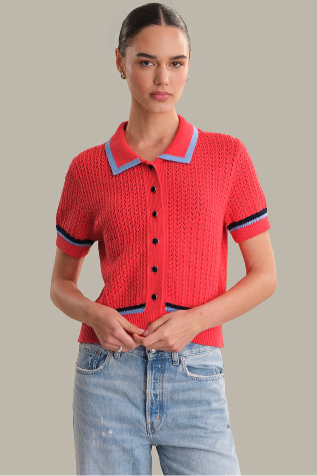 The Dania Pointelle Polo is a short-sleeve pointelle knit polo with a button-front placket and contrast-trim collar for a refined, preppy look. This style from 525 America pairs a lightweight openwork knit with ribbed hems and sleeves for subtle texture and shape. It hits at the waist for a slightly cropped silhouette that layers easily over high-rise jeans or skirts. Wear it as an elevated casual piece that adds crafted detail to everyday outfits.