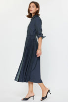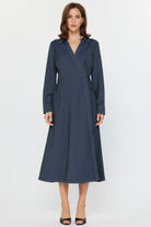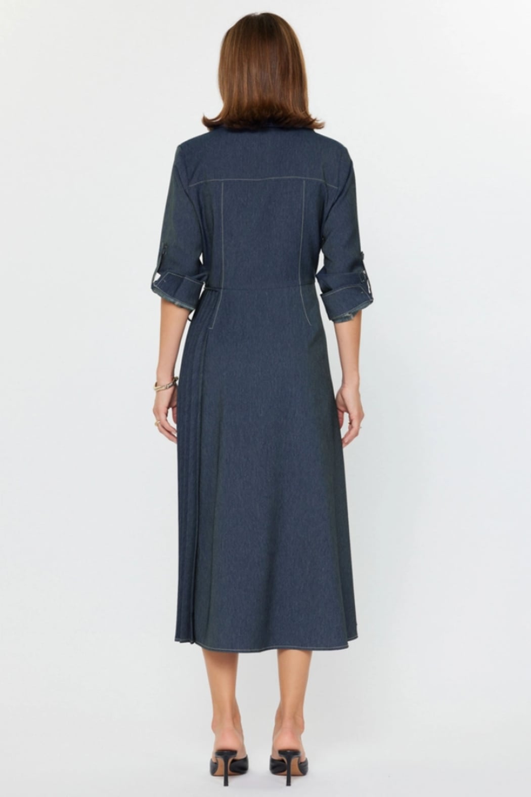 A tailored denim wrap cut that hits mid-calf, the Denim Wrap Midi Dress mixes shirtdress polish with a pleated, swaying skirt. The wrap silhouette ties at the waist and features roll-tab three-quarter sleeves for easy, refined styling. Current Air renders this piece in structured denim for a look that reads both classic and modern. Wear it to the office with low heels or on weekend outings for a put-together casual vibe.