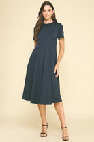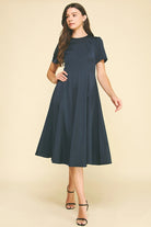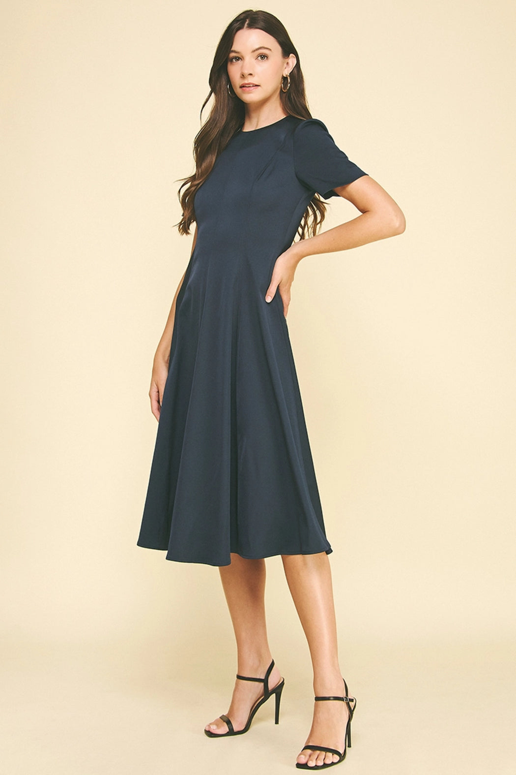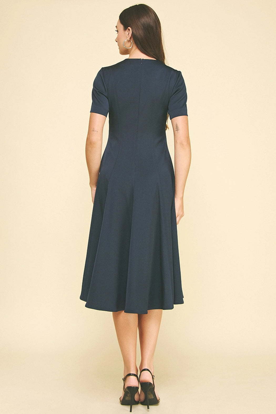 The perfect into holiday dress in this season's warm shade of navy blue. Round neck, short sleeve, with pleated detail and back zipper.