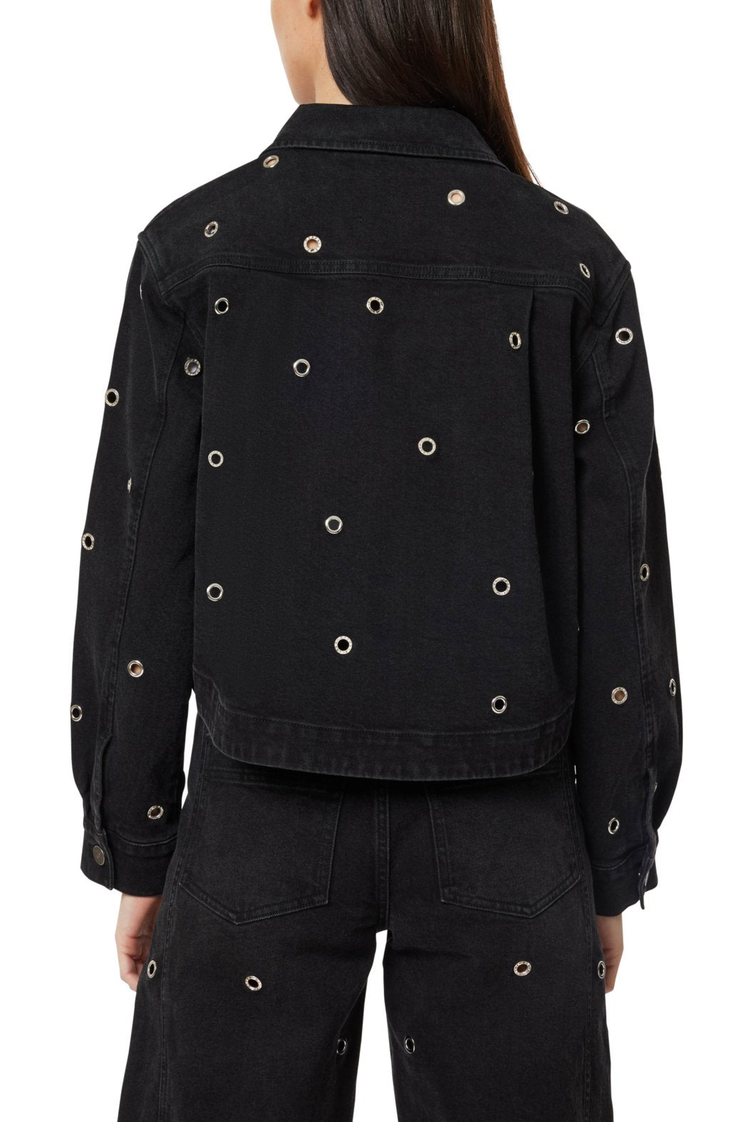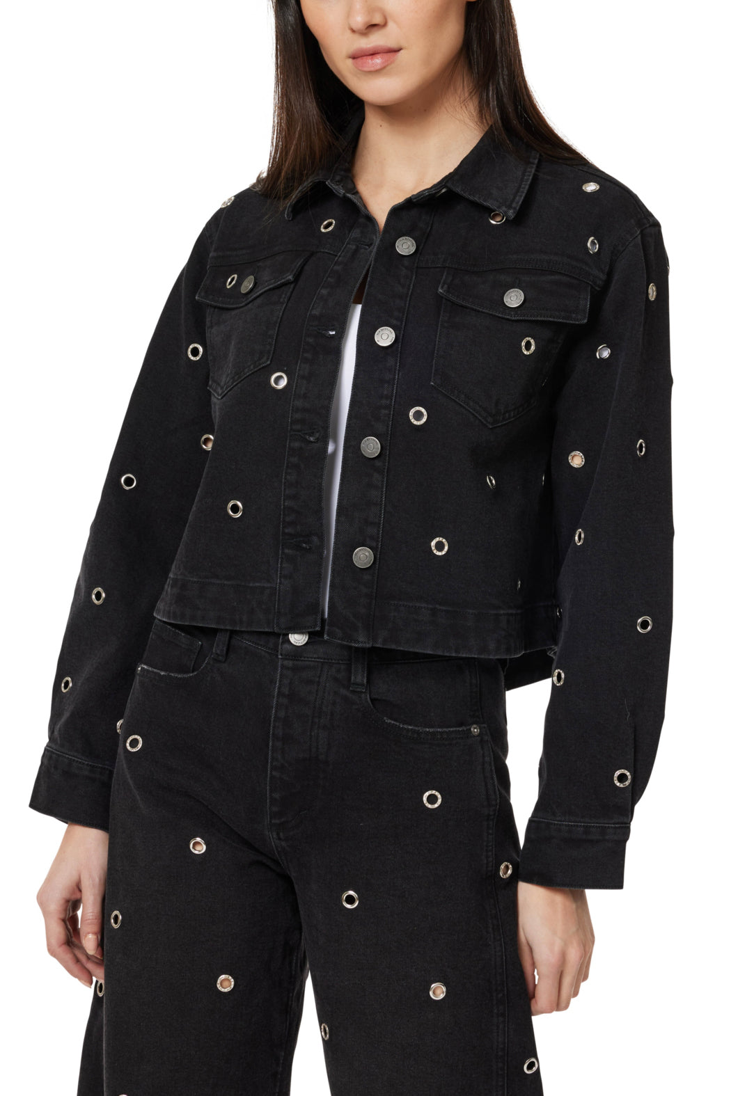 Edgy cropped denim jacket in classic black featuring an all-over silver grommet embellishment that adds punk-rock attitude to this statement piece. The traditional denim jacket silhouette with chest pockets and button-front closure gets a rebellious update with metallic hardware scattered throughout, creating eye-catching texture and visual interest. This bold layering piece instantly transforms any outfit, whether thrown over a simple tee for daytime edge or paired with the matching grommet-detailed pants for a head-turning coordinated set that commands attention.