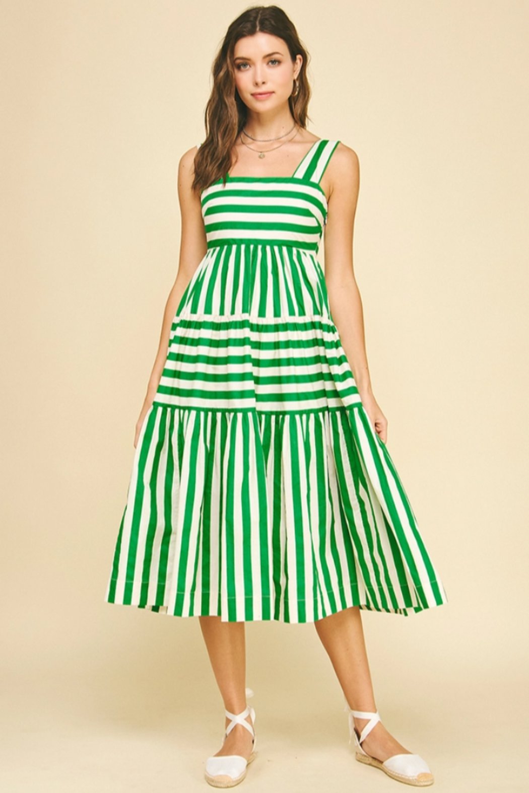 This vibrant green and white striped midi dress brings a fresh, preppy charm to your wardrobe with its bold horizontal stripes and playful tiered design. Made from 100% cotton for all-day comfort, the dress features a square neckline with adjustable shoulder straps and a fitted smocked bodice that flows into a beautifully tiered skirt with multiple ruffle layers. The eye-catching emerald green and crisp white combination creates a striking look that's perfect for summer gatherings, picnics, or any occasion where you want to make a cheerful statement.