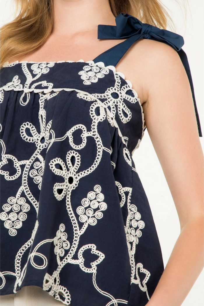 Elegant sophistication meets playful design in our navy tie-shoulder top, featuring delicate white embroidery for a touch of summer charm.