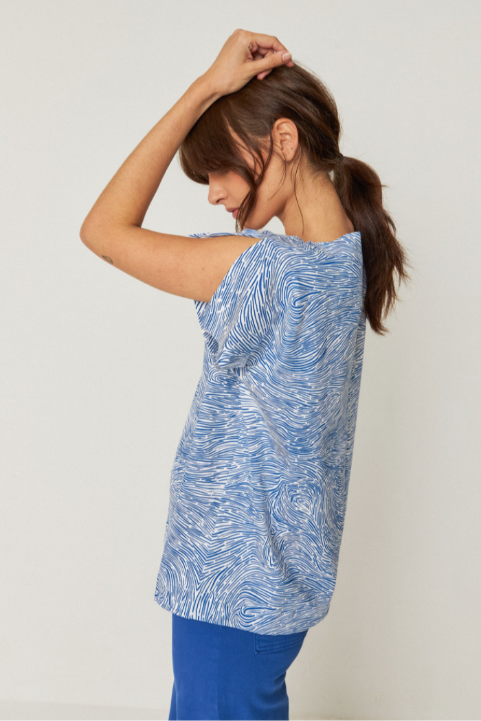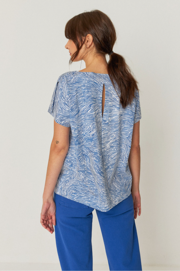 Organic cotton short sleeve top. Rounded collar and small decorative keyhole at the back of the neckline.