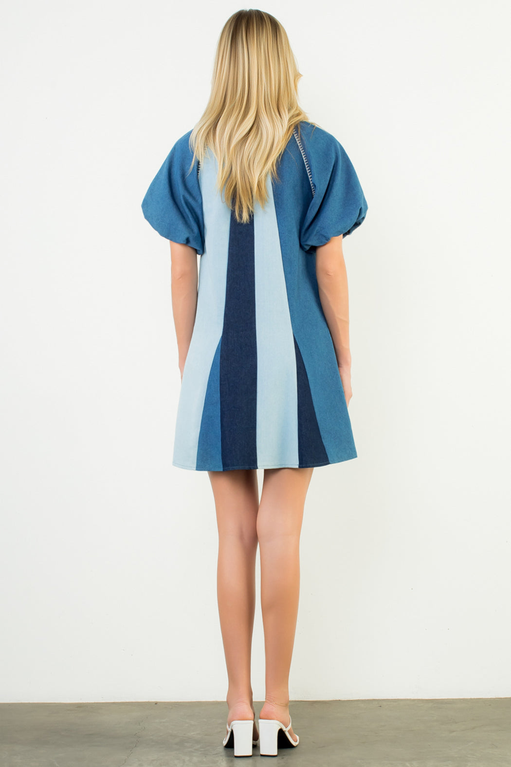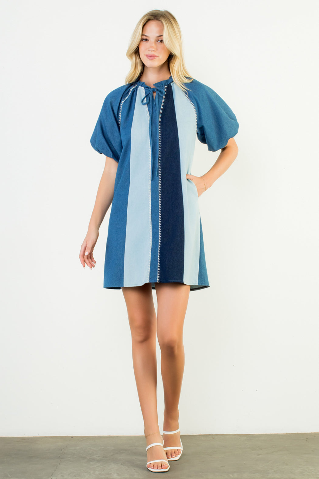 Embrace the autumn season with our sophisticated color-block shift dress, designed to layer perfectly with your favorite fall accessories and cozy knits. The rich blue tones and substantial cotton fabric provide warmth and style, while the voluminous puffed sleeves and front tie create a refined silhouette that transitions effortlessly from crisp morning walks to evening gatherings. Pair this versatile dress with ankle boots and a structured jacket for a quintessential fall look that combines comfort, warmth, and contemporary elegance.