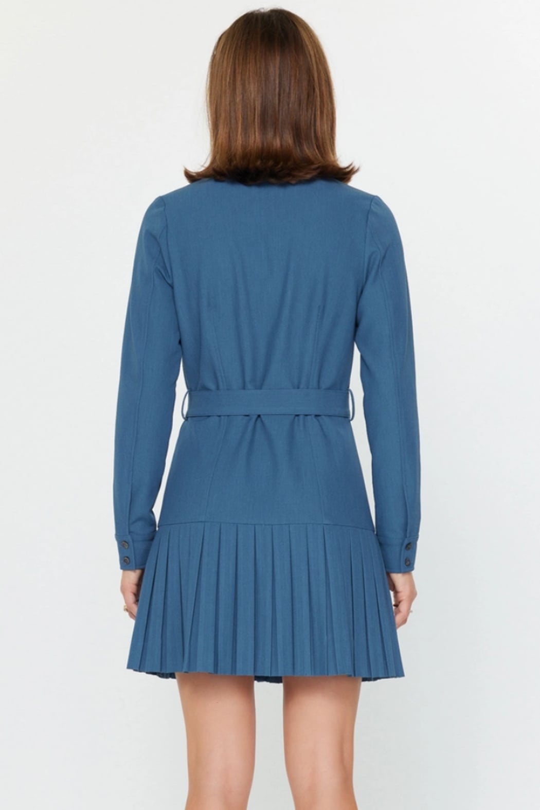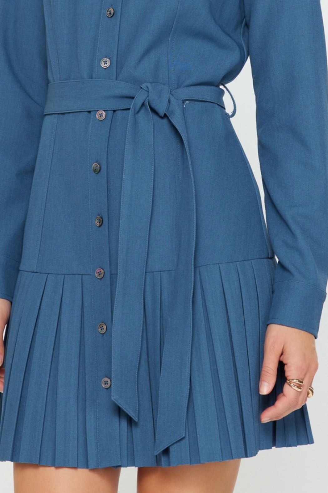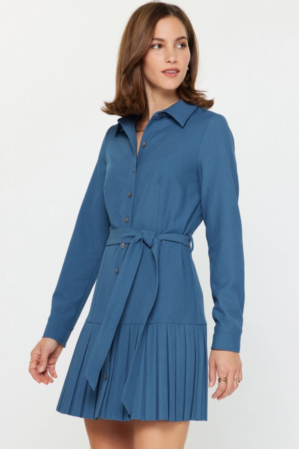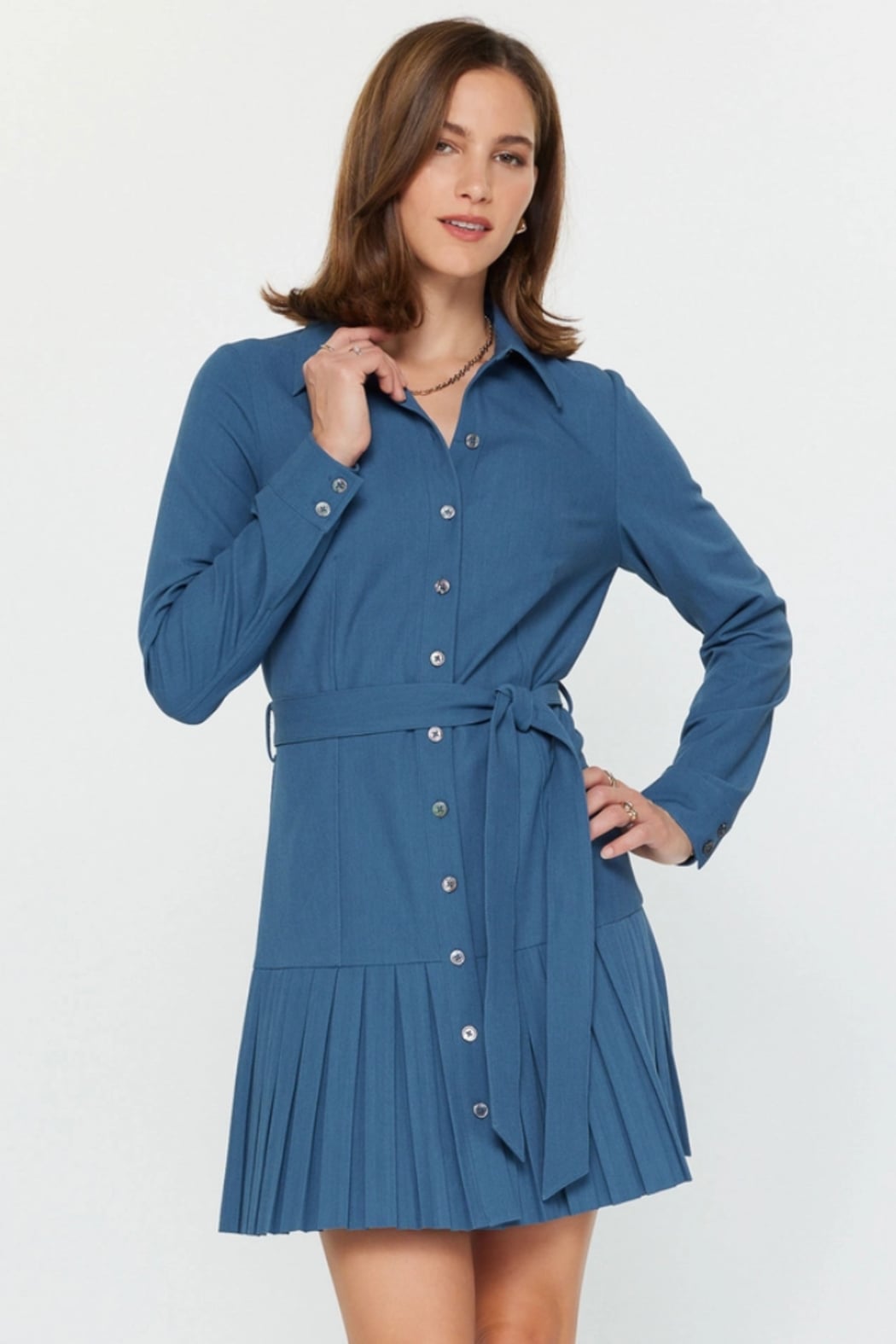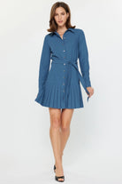 A tailored pleated button-down shirt dress with a fitted waist tie and long sleeves for polished everyday style. The Pleated Button-Down Shirt Dress by Current Air features a classic collared bodice, full button front and a sharply pleated mini skirt hem. Lightweight woven fabric and a self-belt create a flattering, work-ready silhouette that transitions easily to weekend wear. Wear it with boots or flats for a preppy, timeless look. Fabric: 70%POLY 25%RAYON 5%SPAN