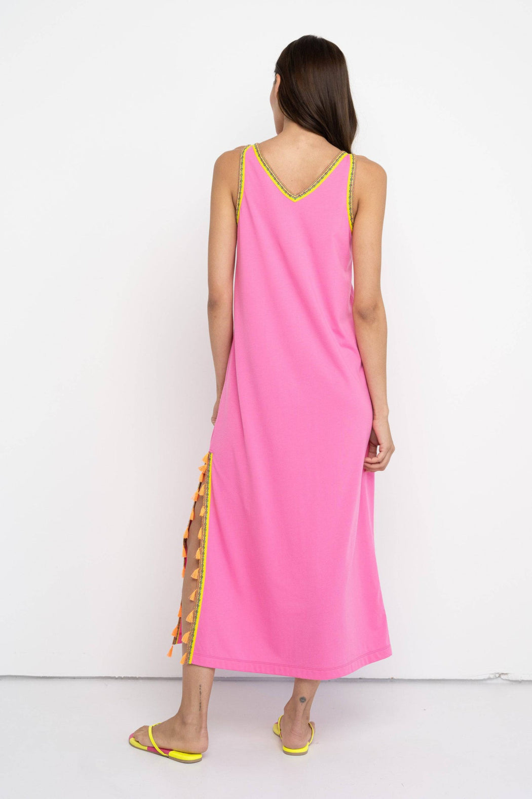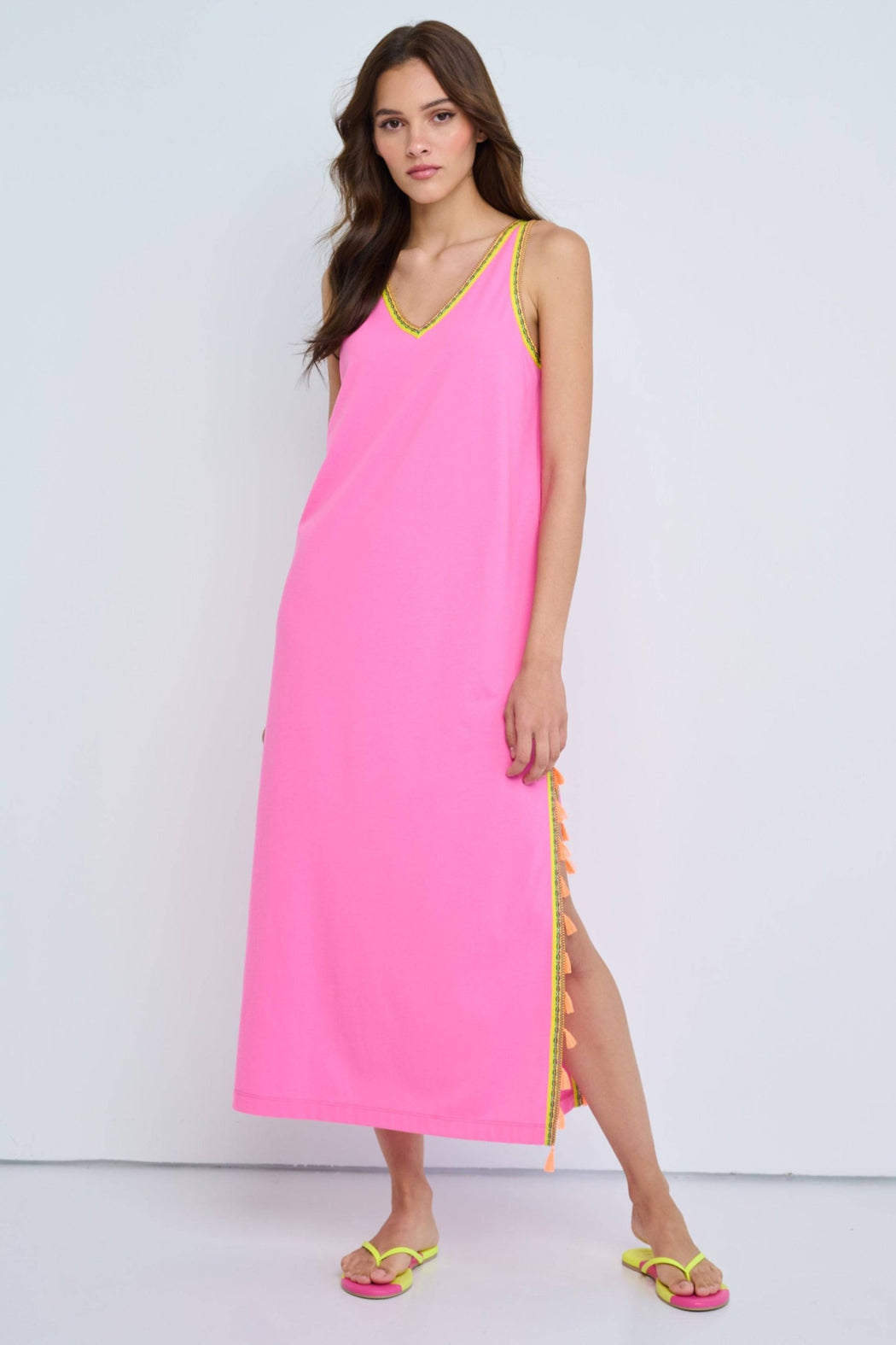 The Tassel Toss maxi dress is made from premium soft Cotton. This V-neck sleeveless dress has a single side slit for ease and gentle flow. The pops of color in the handcrafted embroidered trims and tassels are the perfect finishing touches.