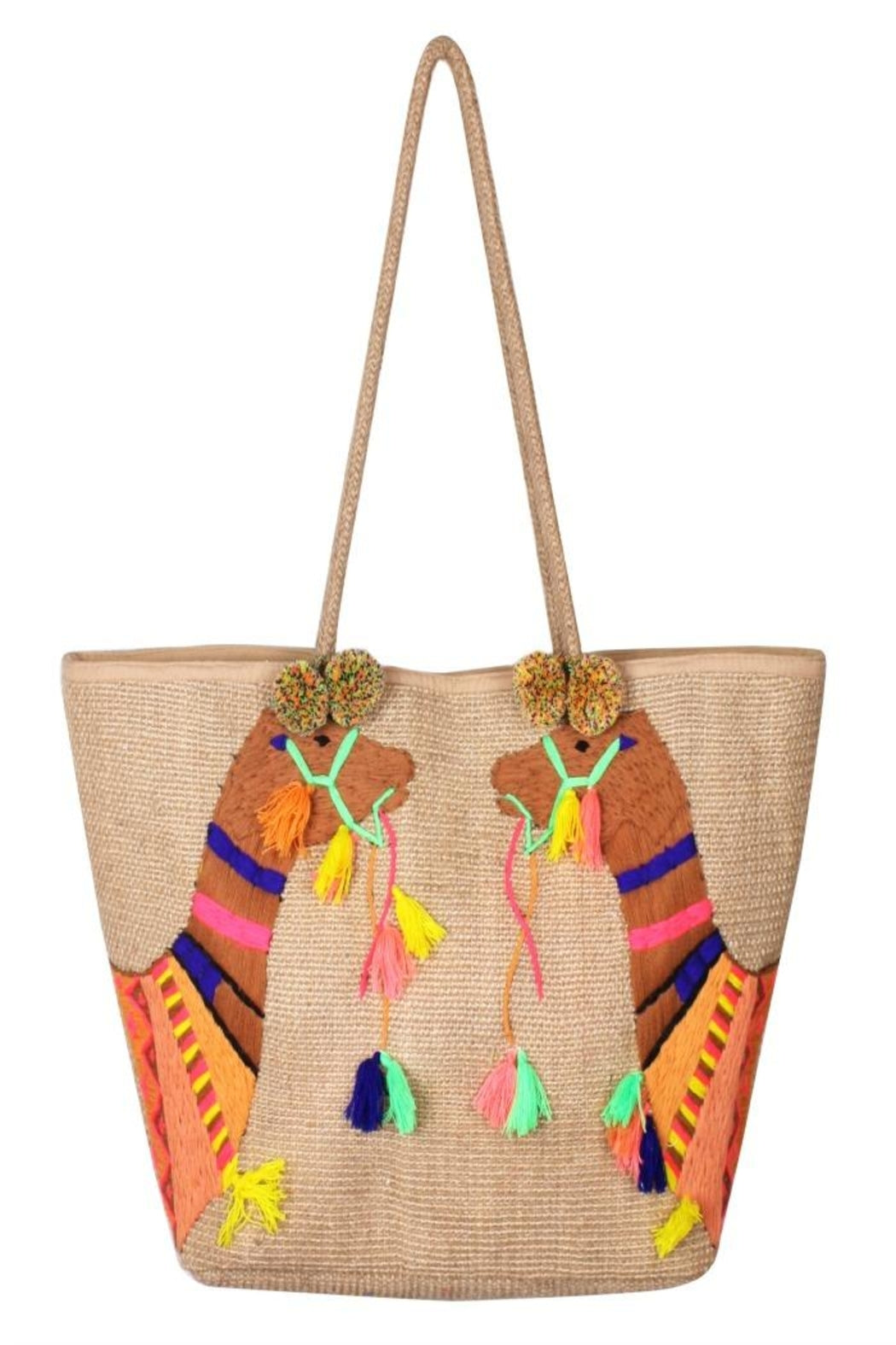 Fabulous camel theme bag. Measures 22" x 13". Double handles can be worn as a shoulder bag. Inside has a zipper compartment and fitted for a cell phone. This style is produced in limited numbers and handwoven on looms using recycled and regenerated cotton/jute. Your purchase of thisproeduct directly impacts the artisan community through fair wages and business/skill training.