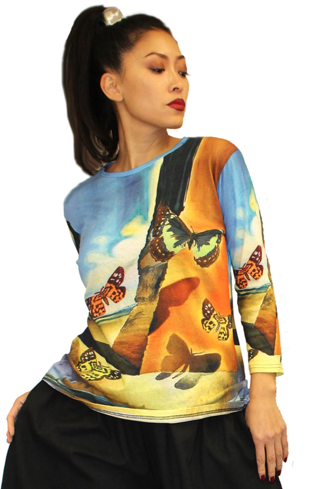 Fantastic Dali Inspired 3/4 Length Fitted T-Shirt. Beautiful Butterfly Theme. Jewel Neckline.- size is S/M