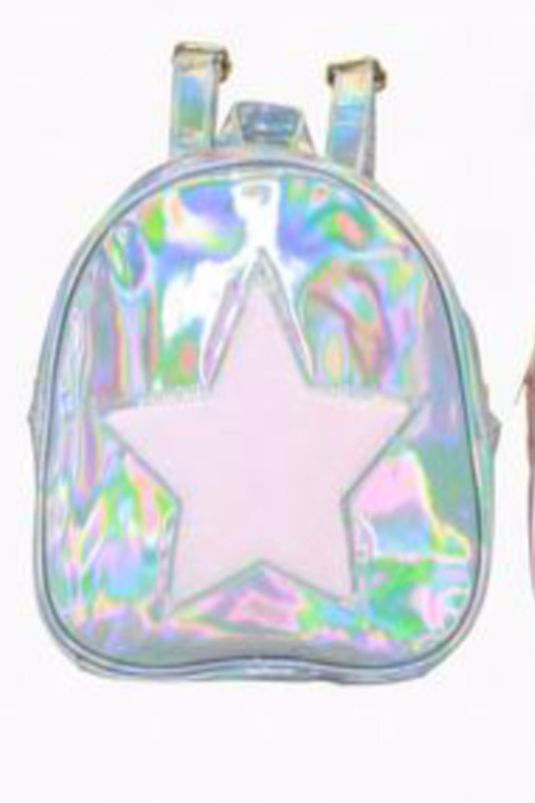 Plush Pink Star Adorns this beautiful backpack. Compartments on both sides and zippered compartment inside. Adjustable Straps and hanging hook. Measures 9" x 9"X 4"deep.