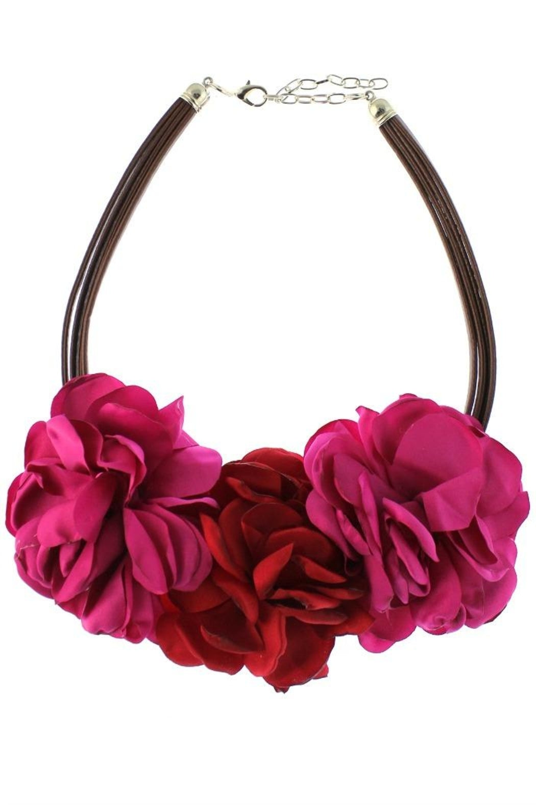 Fantastic neckpiece:Three oversized flower buds on leather bands. Size adjustable. almost 3" extra chain.